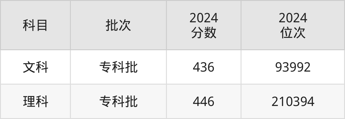 2024年绵阳职业技术学院在四川省内专科批的录取分数线都在430分以上,在文科的录取分数线为436分;理科的录取分数线为446分。