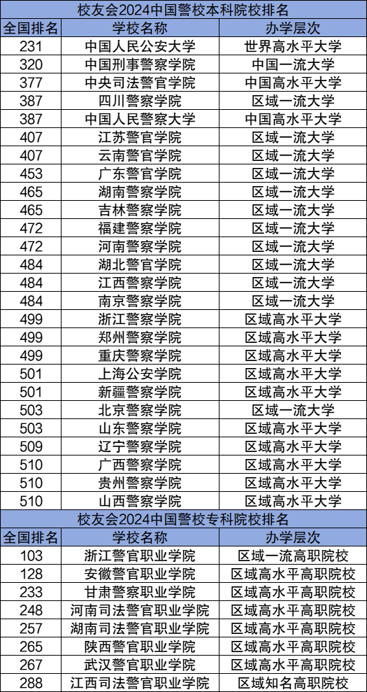高职专科批录取的警校共有8所,包含江西司法警官职业学院、浙江警官职业学院、河南司法警官职业学院、陕西警官职业学院、湖南司法警官职业学院等。不同警校的实力不同,导致在校友会政法类高校中的排名也不同,以下是为大家整理的警校全国排名情况及名单一览表: