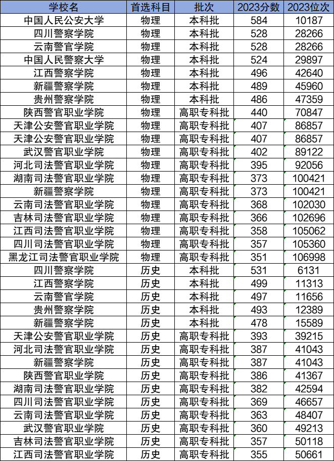 在历史科目类中,警校最低分普通都集中在355分到530分之间,只有5所高校在本科批次录取,主要是贵州警察学院、四川警察学院、新疆警察学院、云南警官学院等;有10所高校在高职专科批录取,包含天津公安警官职业学院、四川司法警官职业学院、吉林司法警官职业学院等。