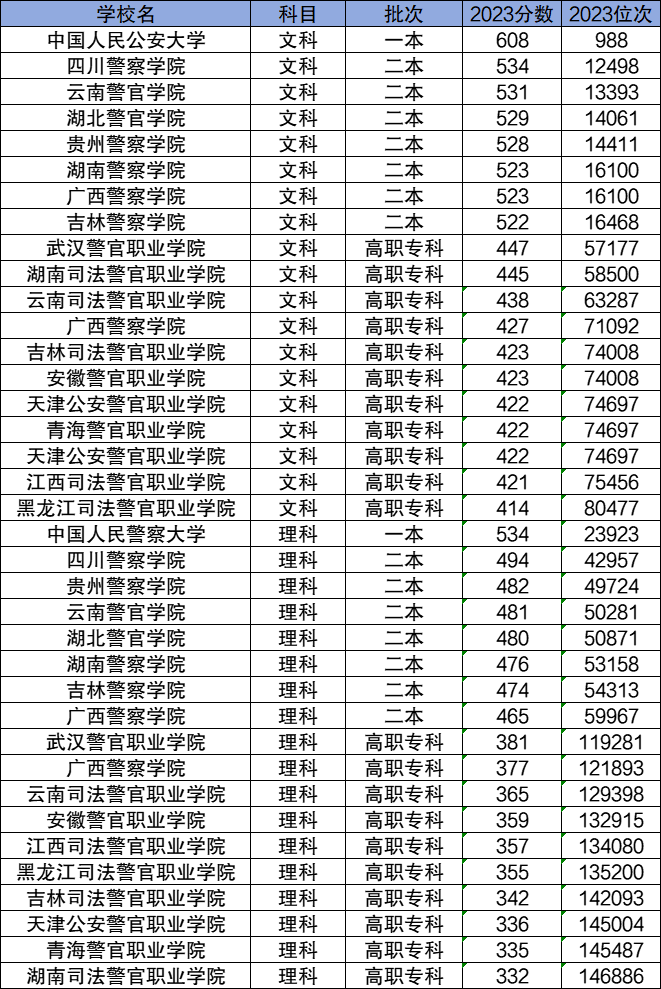 由于警校每年都会在本科批次和专科批次录取,因此对于部分学校而言,录取分数线都不会太高,根据数据显示最低分在350分左右是有机会被录取的。以下是警校在重庆和云南2023年最低录取数据,希望能够帮助到各位考生。