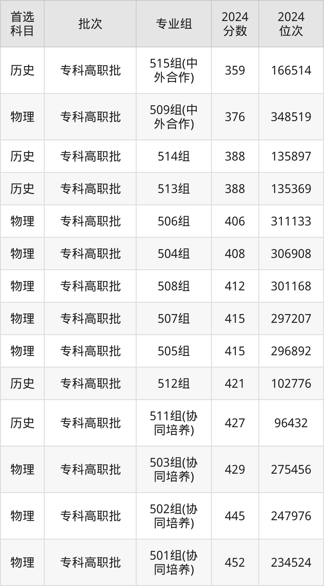 2024年中山职业技术学院在广东省内专科批录取分数线都在350分以上,物理类整体录取分数线要高于历史类,具体详情见下文。