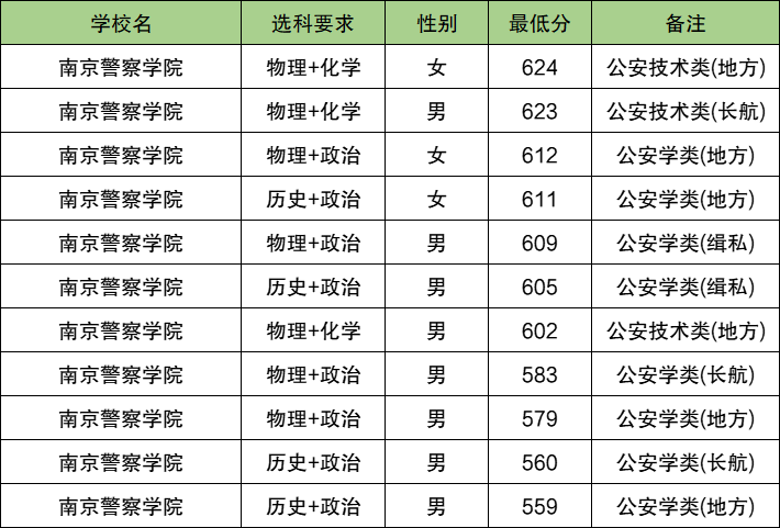 | 江苏警官学院 | 物理+化学 | 男 | 606 |