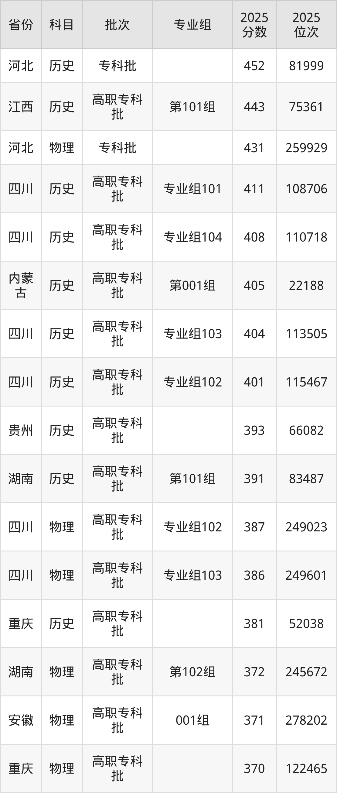 2025年重庆青年职业技术学院全国录取分数线346分到452分,录取最高在河北(历史)、录取最低在四川(专业组101)。