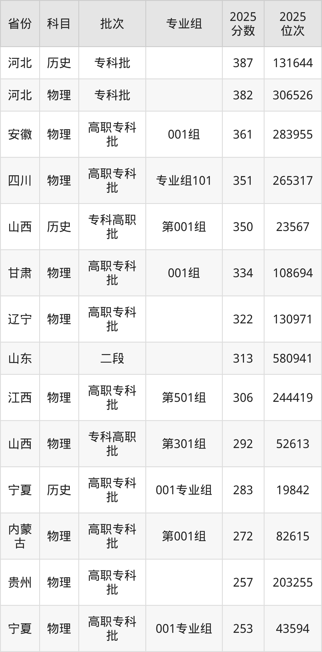 下面是2025年烟台工程职业技术学院在全国各省录取最低分数据及位次,各位考生也可作为一个参考。