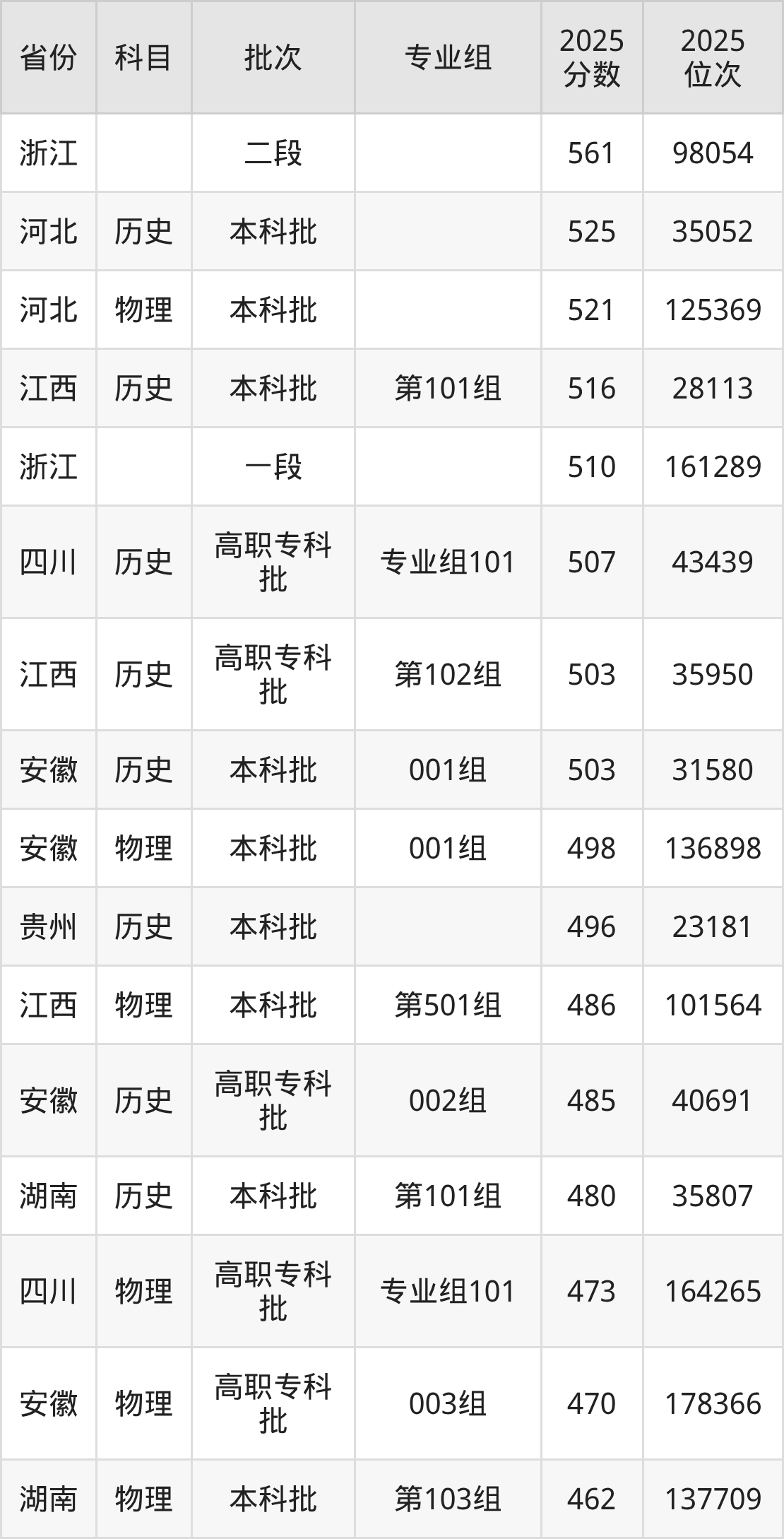 参考2025年贵州省高考招录数据,按照分数线从高到低依次为大家展示金华职业技术大学各个专业录取分数线。