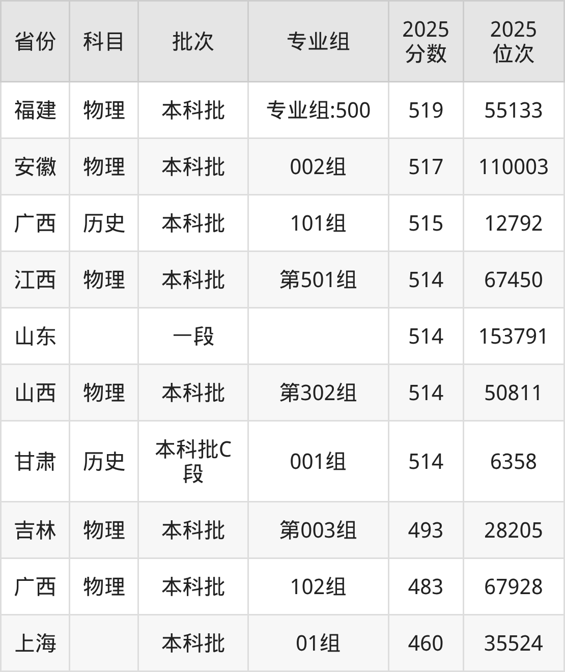 2025年云南警官学院各专业录取分数线从514分到545分不等,录取分数线最低的专业是网络空间安全;录取分数线最高的专业是法学。本文将展示云南警官学院所有专业最低分数线及位次,供2026届高考生参考。