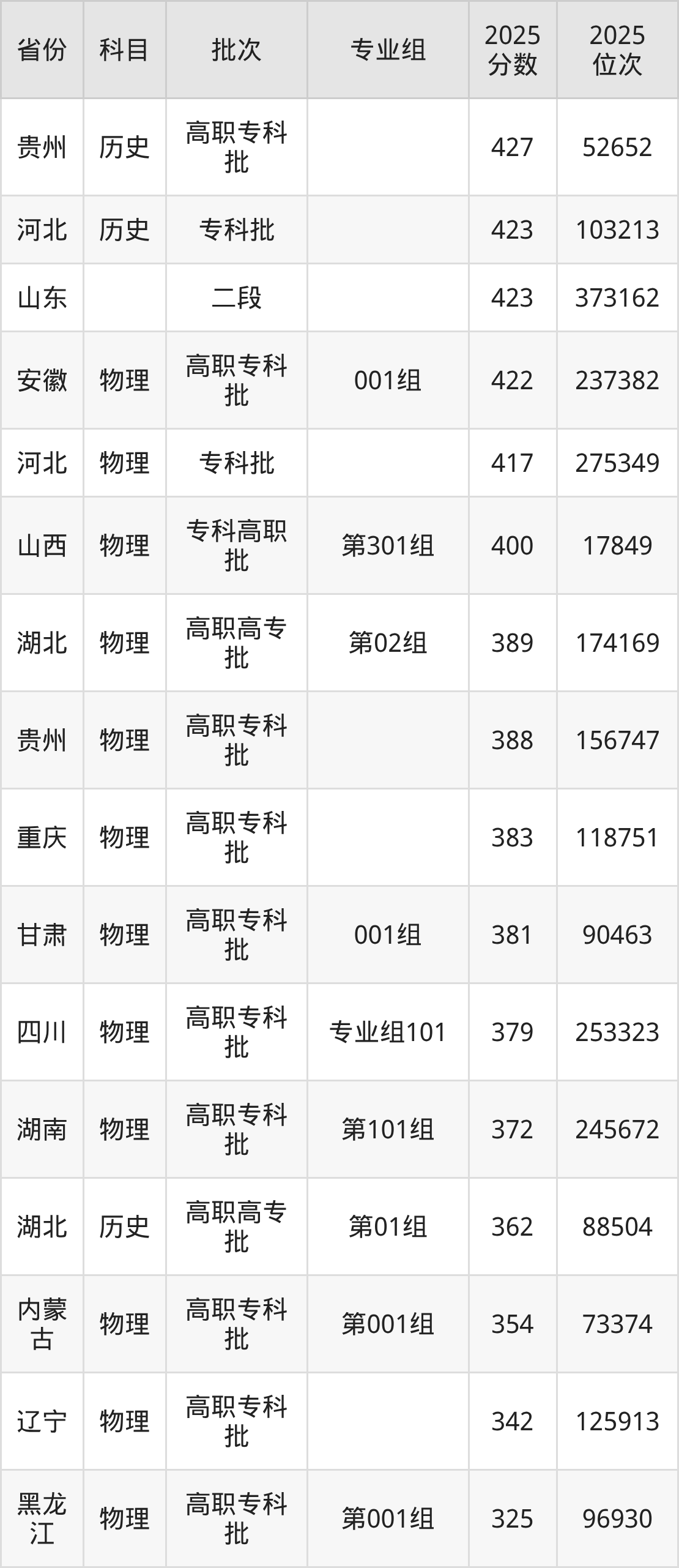 2025年河南工业职业技术学院全国录取分数线325分到427分,录取最高在贵州(历史)、录取最低在黑龙江(第001组)。
