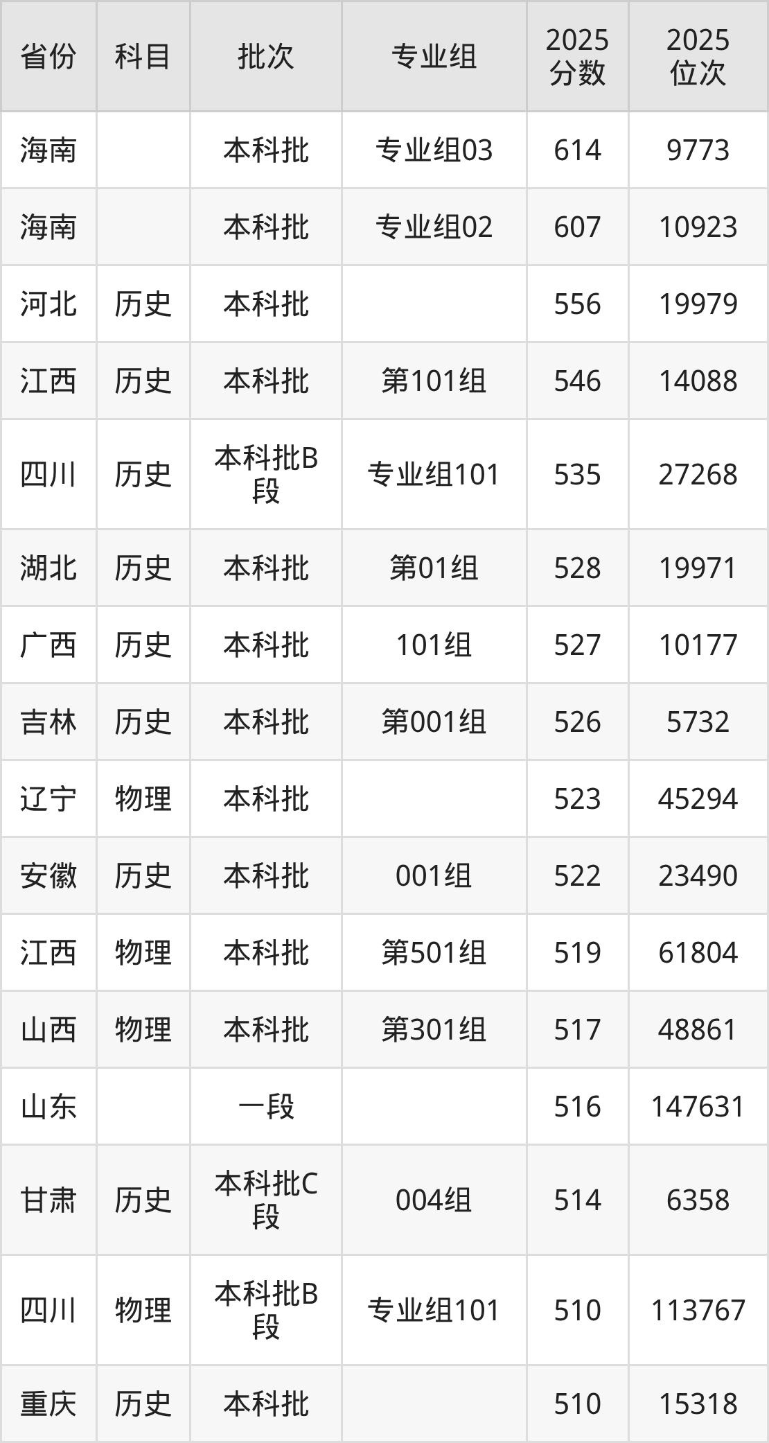 2025年郑州师范学院全国录取分数线312分到614分,录取最高在海南(专业组03)、录取最低在新疆(理科)。
