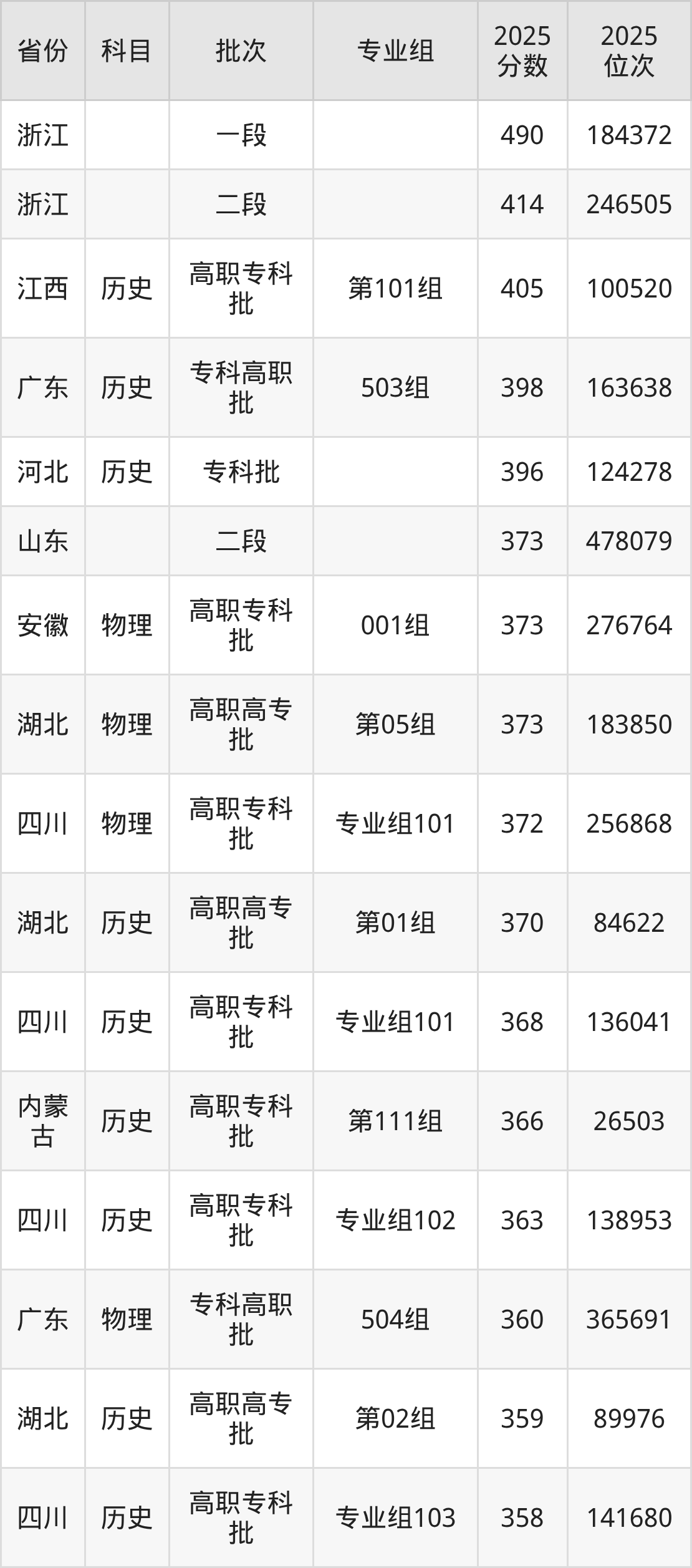 2025年荆州理工职业学院全国录取分数线150分到490分,录取最高在浙江、录取最低在四川(专业组104)。