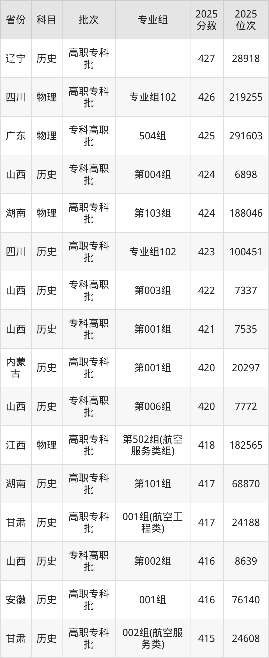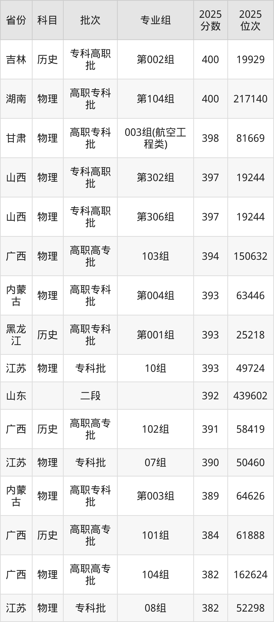 参考2025年山东省高考招录数据,按照分数线从高到低依次为大家展示江苏航空职业技术学院各个专业录取分数线。