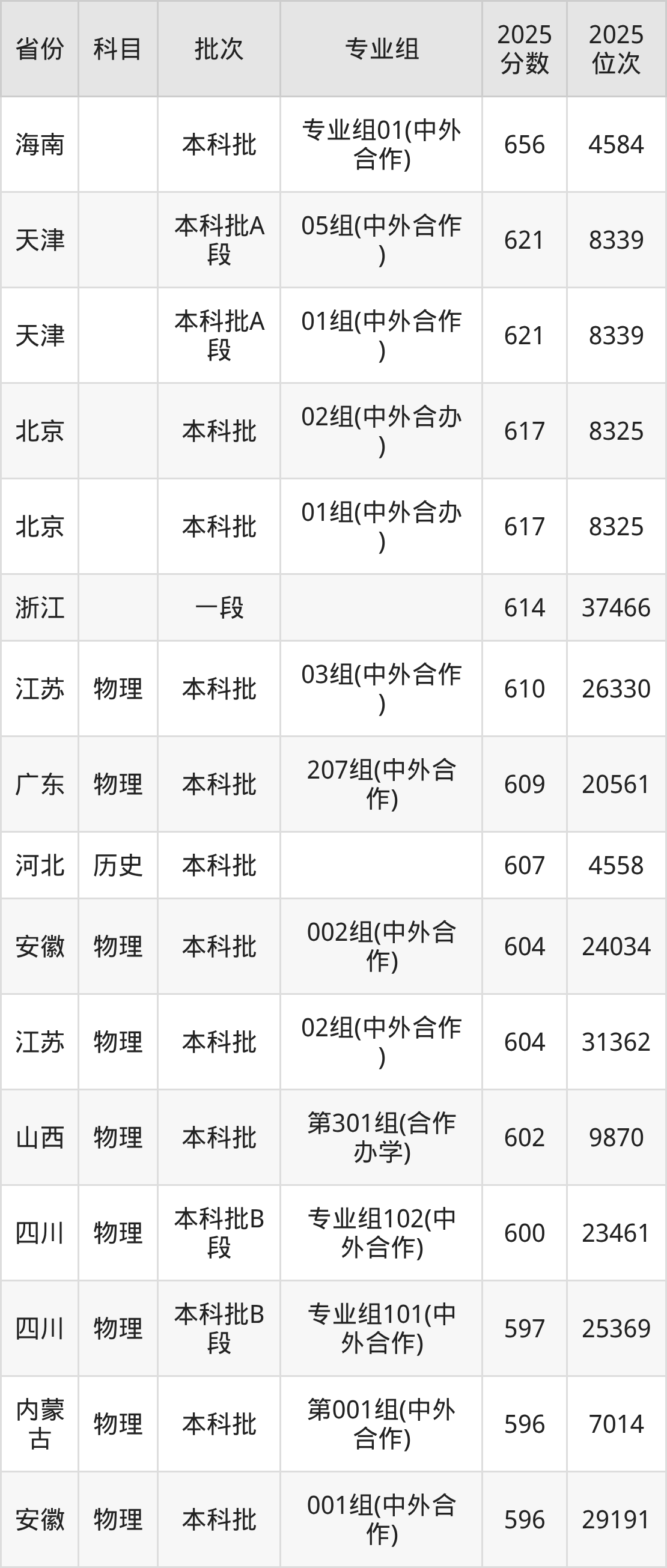 2025年北京交通大学(威海校区)全国录取分数线453分到656分,录取最高在海南(专业组01(中外合作))、录取最低在新疆(文科)。