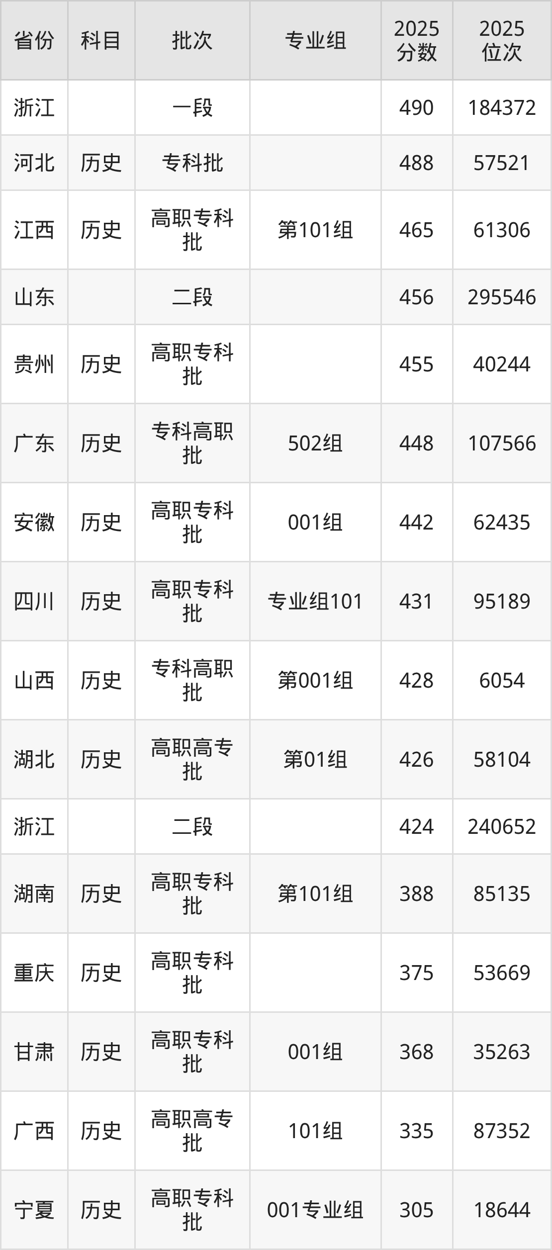 2025年焦作师范高等专科学校全国录取分数线305分到490分,录取最高在浙江、录取最低在宁夏(001专业组)。
