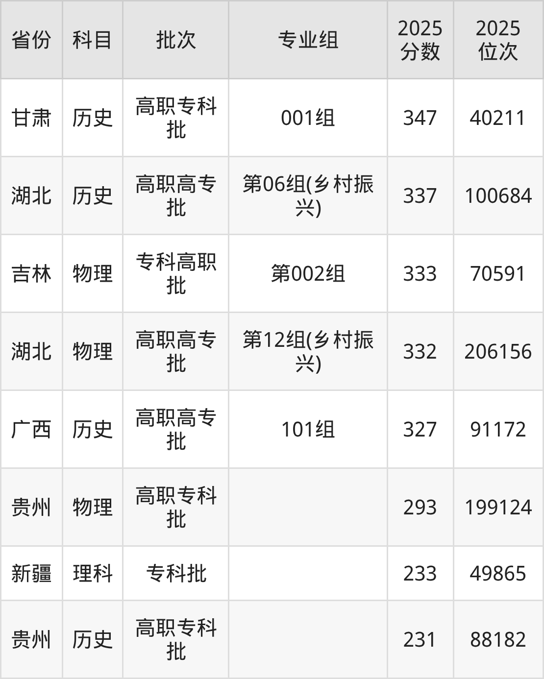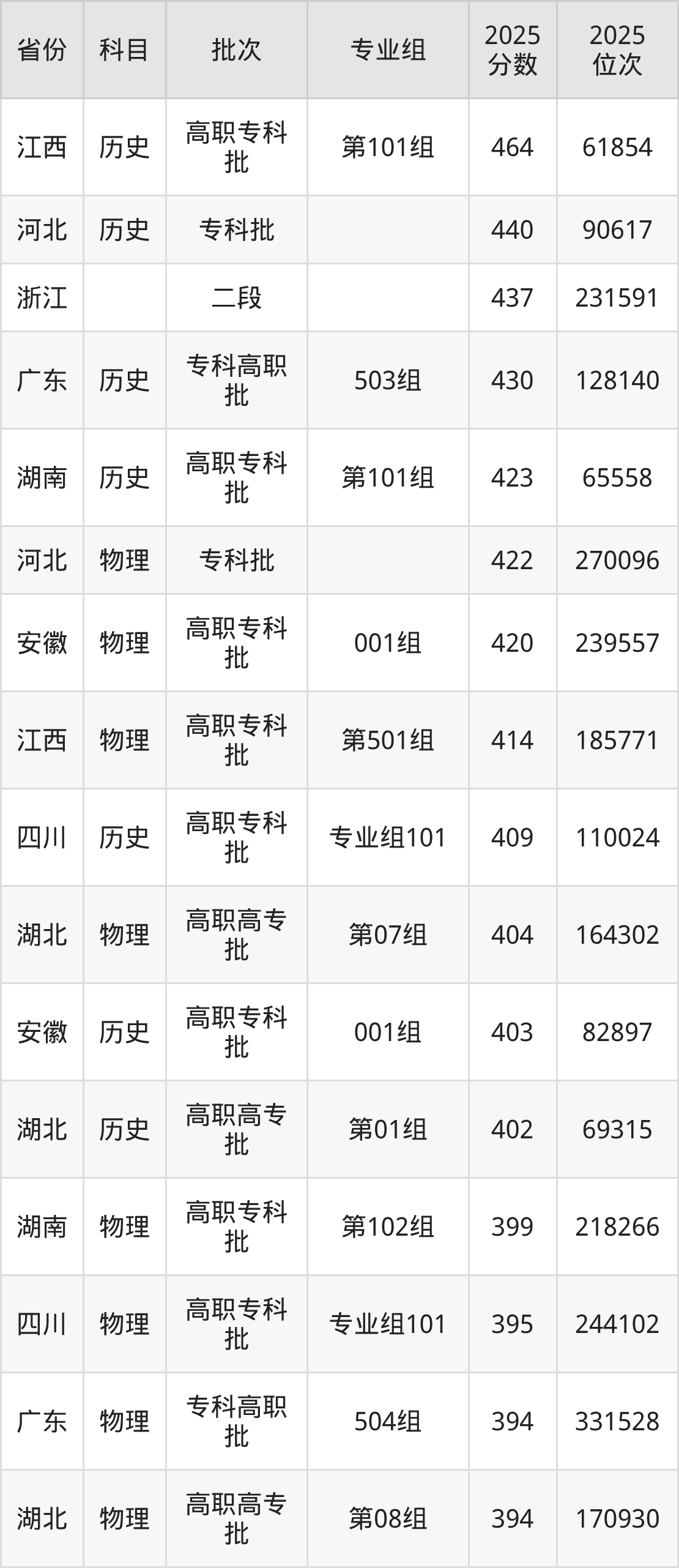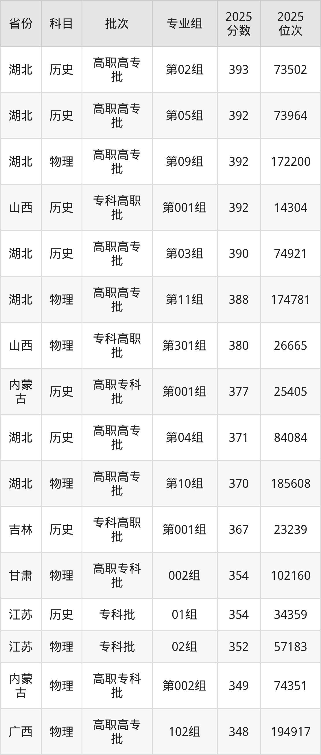 下面是2025年武汉工程职业技术学院在全国各省录取最低分数据及位次,各位考生也可作为一个参考。