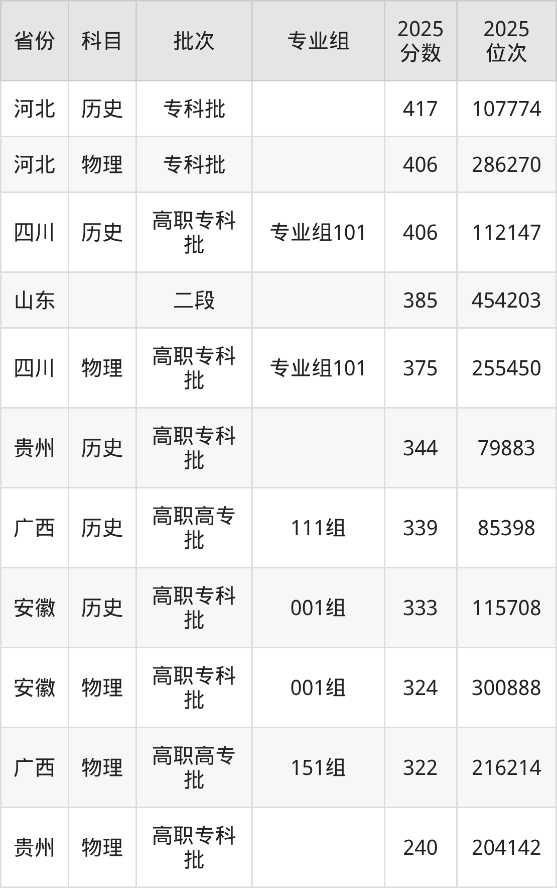 2025年广西体育高等专科学校全国录取分数线240分到417分,录取最高在河北(历史)、录取最低在贵州(物理)。