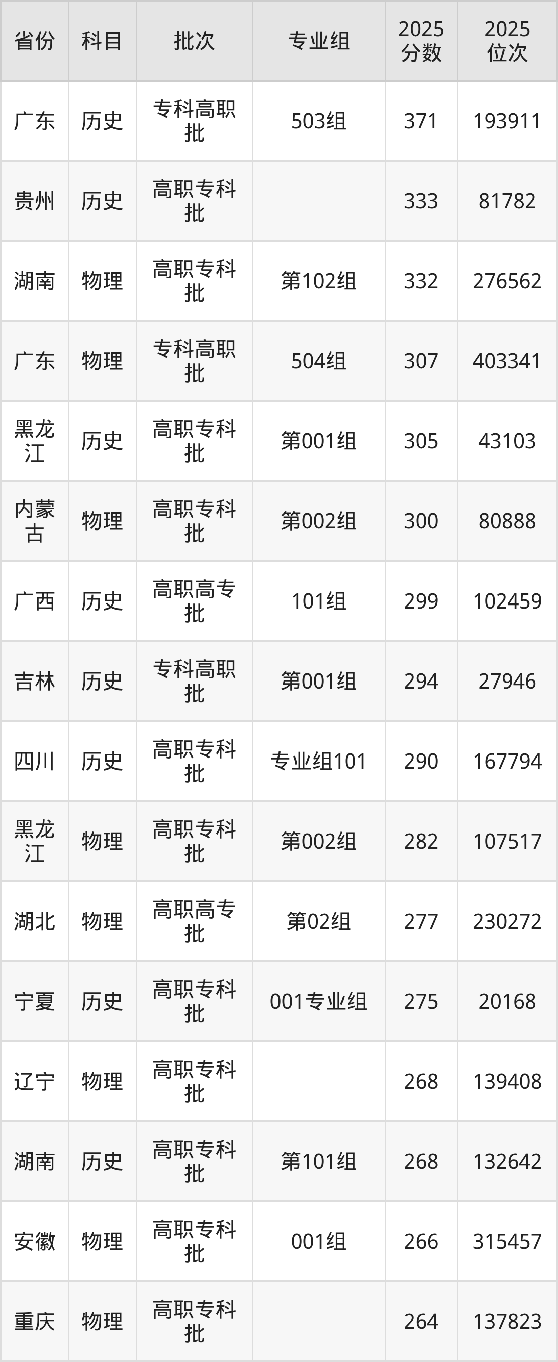 2025年石家庄科技信息职业学院全国录取分数线150分到371分,录取最高在广东(503组)、录取最低在四川(专业组101)。