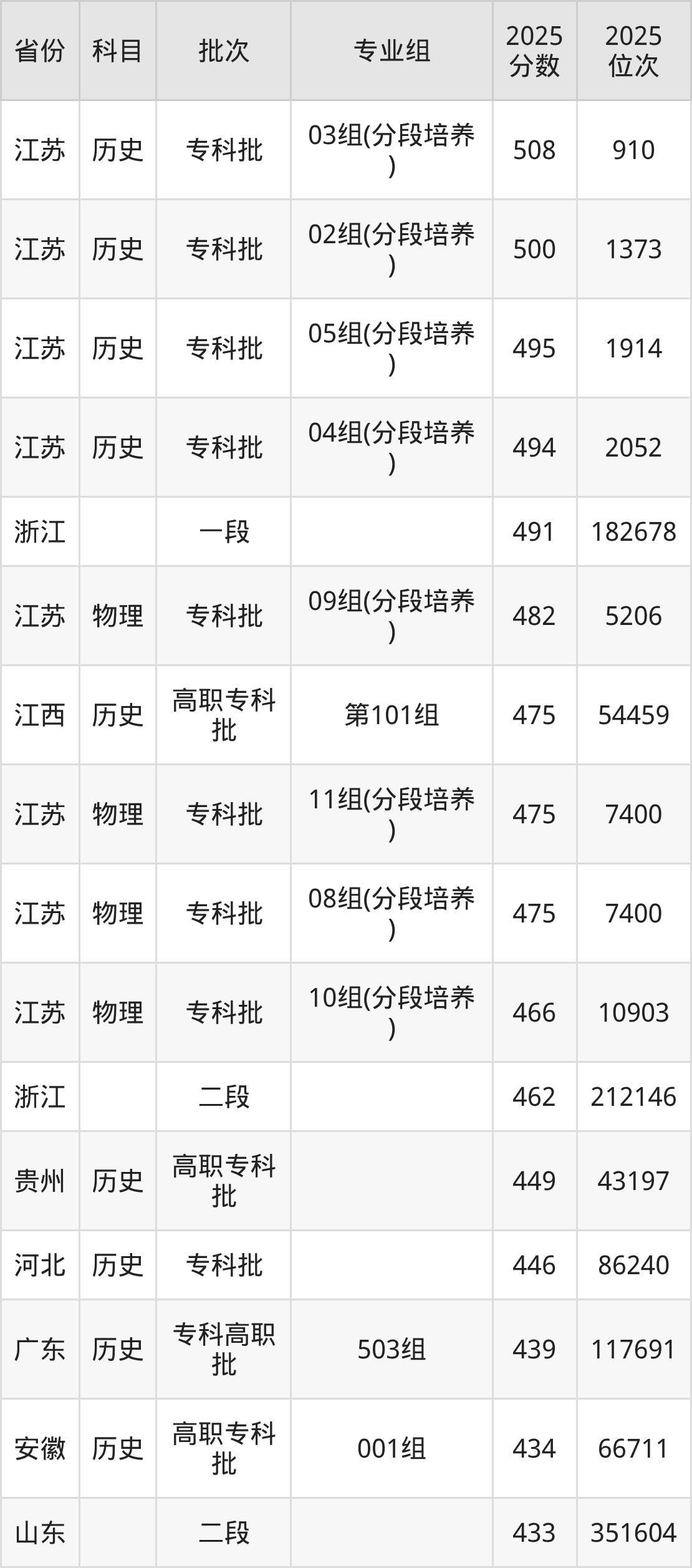 2025年江苏食品药品职业技术学院全国录取分数线192分到508分,录取最高在江苏(03组(分段培养))、录取最低在新疆(理科)。
