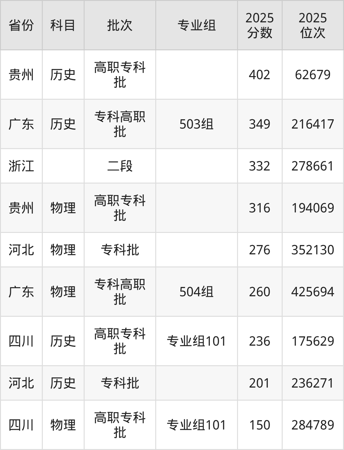 2025年湖南工商职业学院全国录取分数线150分到402分,录取最高在贵州(历史)、录取最低在四川(专业组101)。