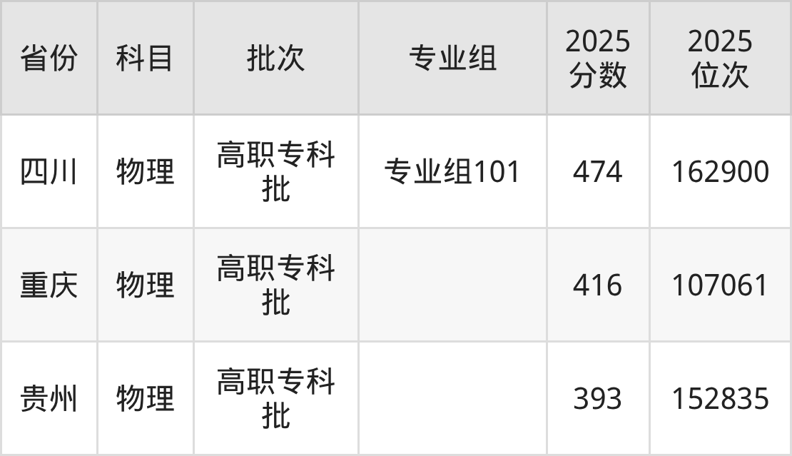 2025年四川电力职业技术学院全国录取分数线393分到474分,录取最高在四川(专业组101)、录取最低在贵州(物理)。