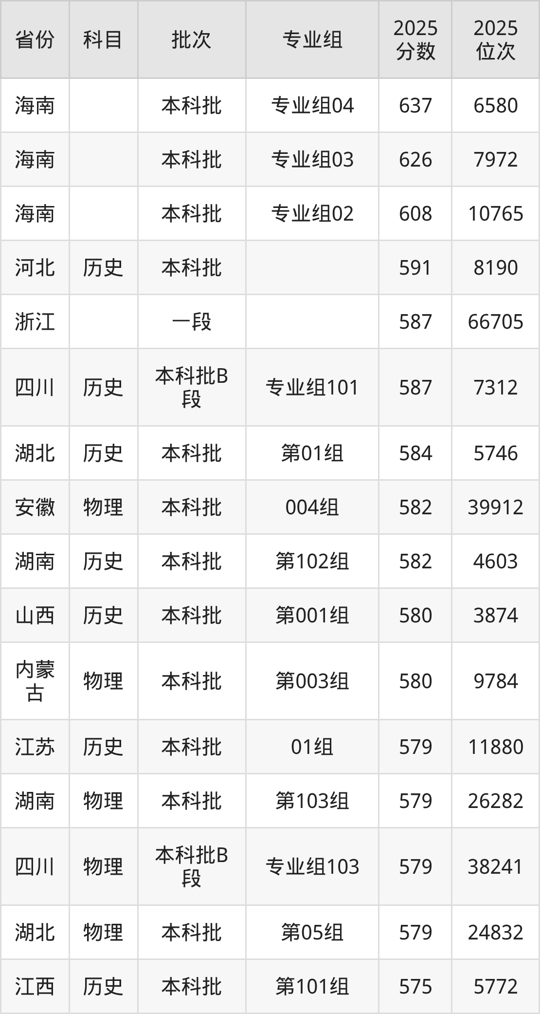 2025年天津财经大学全国录取分数线429分到637分,录取最高在海南(专业组04)、录取最低在广西(507组(国家专项))。