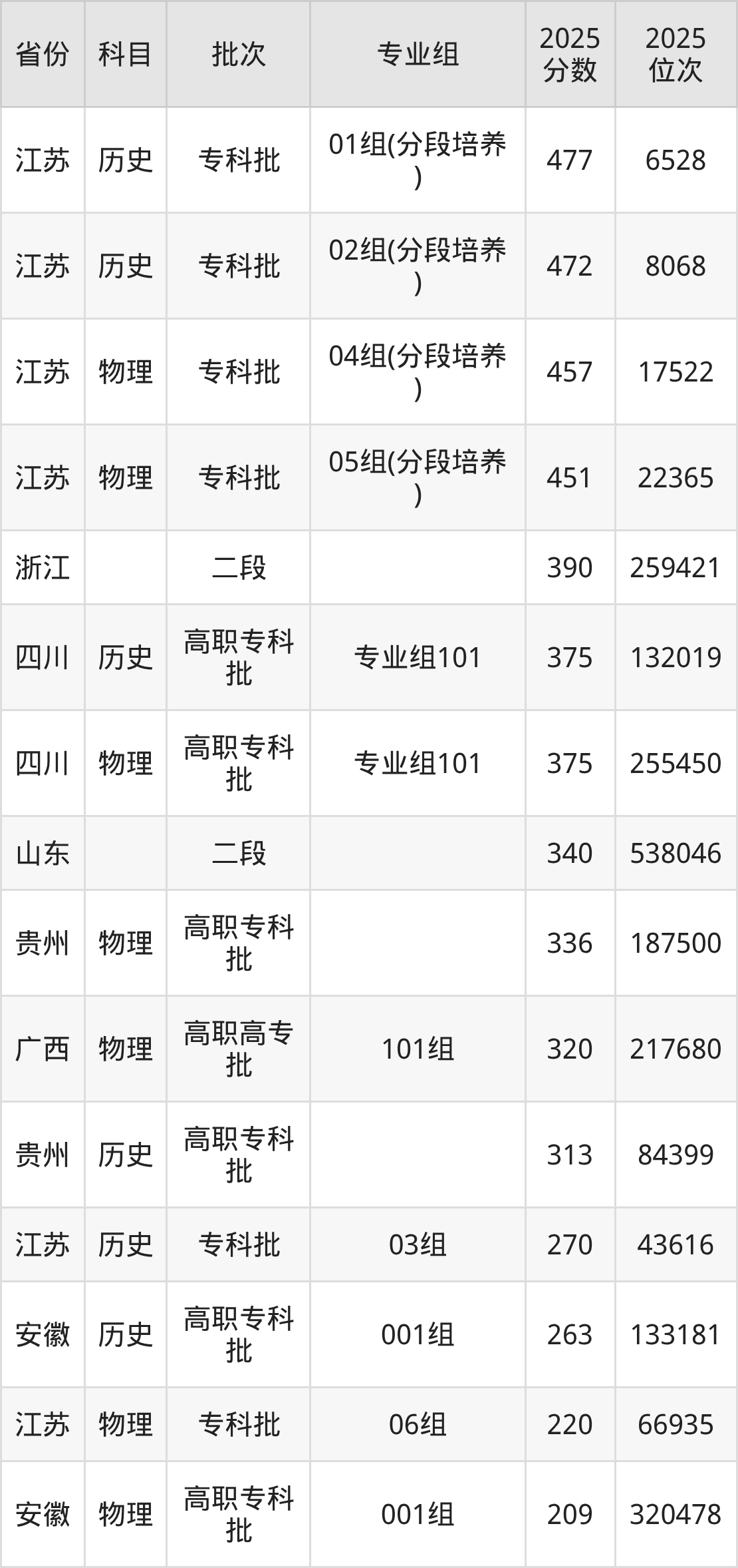 2025年正德职业技术学院全国录取分数线209分到477分,录取最高在江苏(01组(分段培养))、录取最低在安徽(001组)。