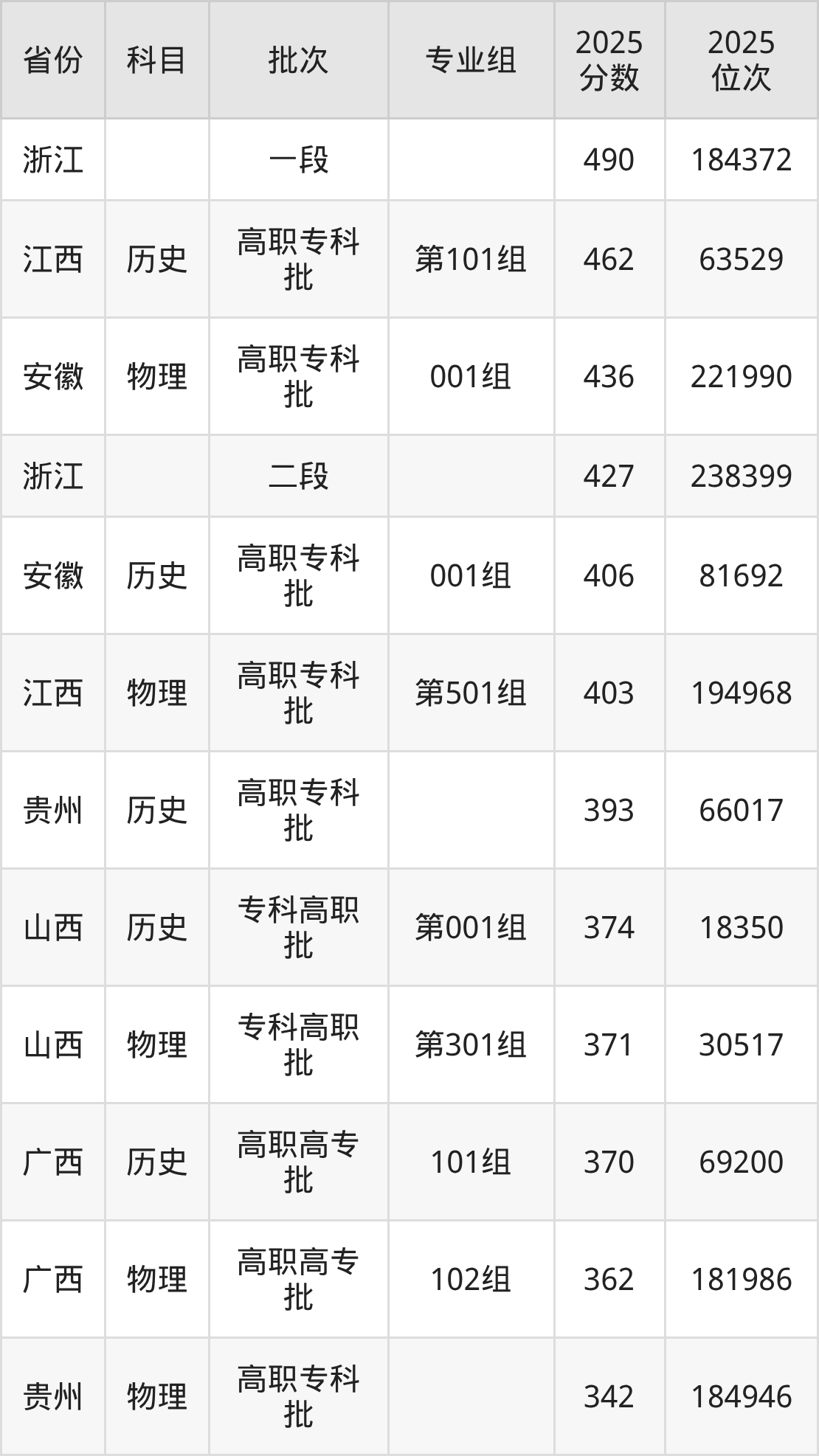 2025年杭州万向职业技术学院全国录取分数线342分到490分,录取最高在浙江、录取最低在贵州(物理)。