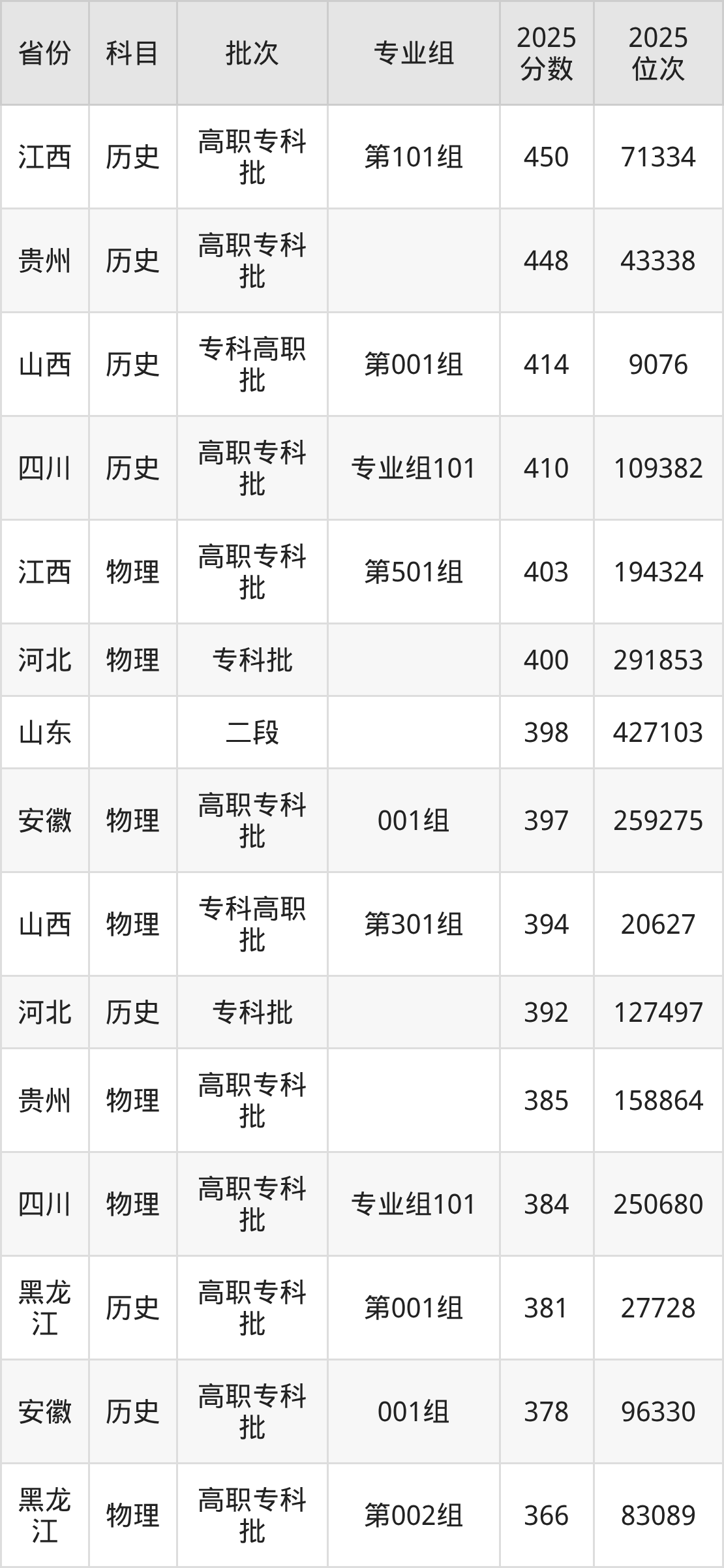 2025年安徽国防科技职业学院全国录取分数线366分到450分,录取最高在江西(第101组)、录取最低在黑龙江(第002组)。