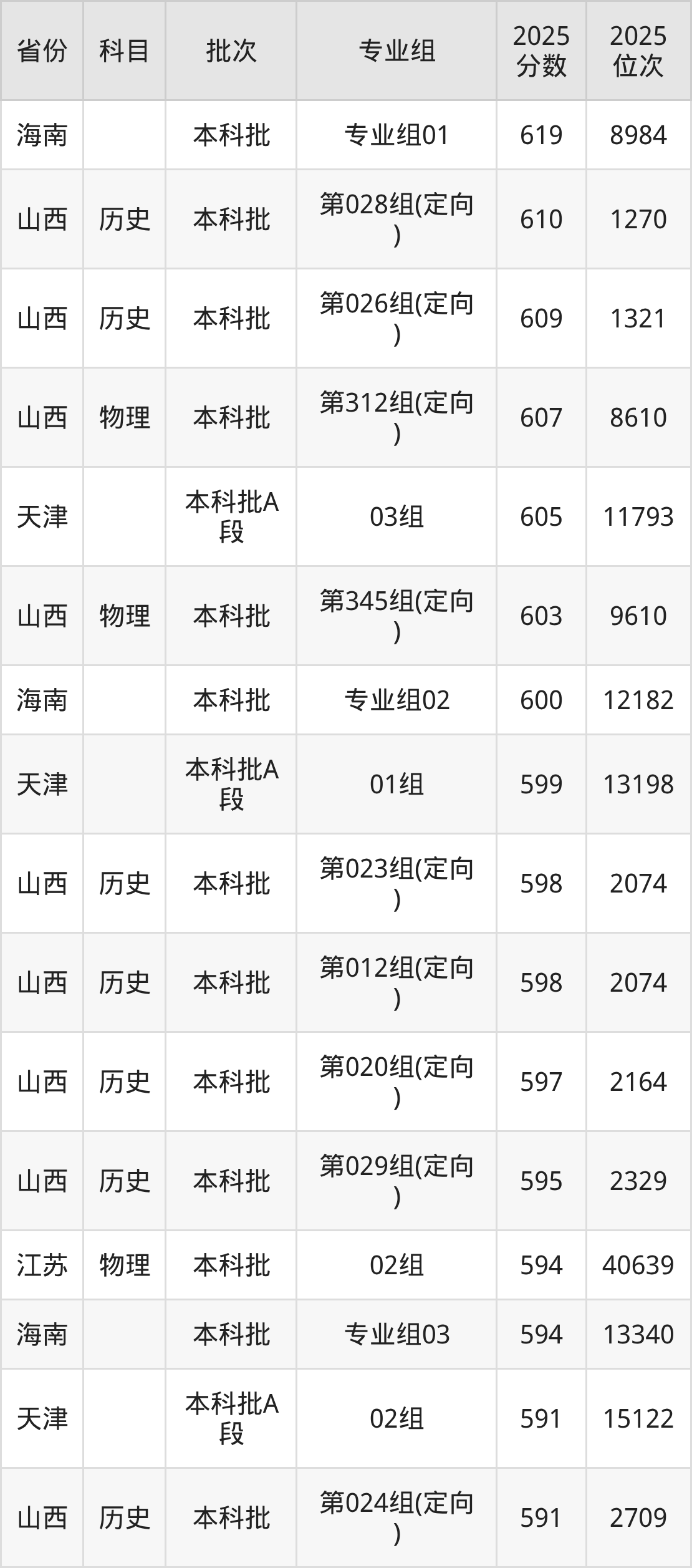 2025年山西大学全国录取分数线440分到619分,录取最高在海南(专业组01)、录取最低在新疆(理科)。