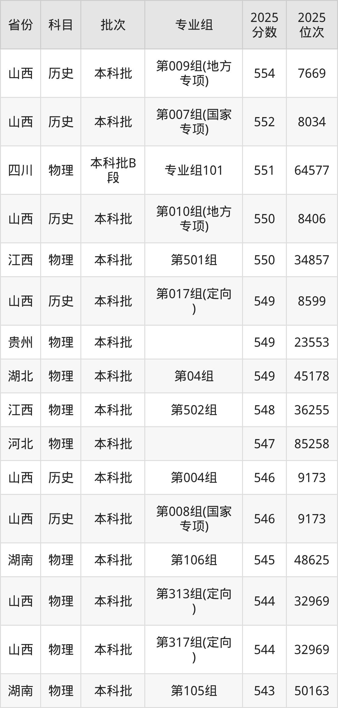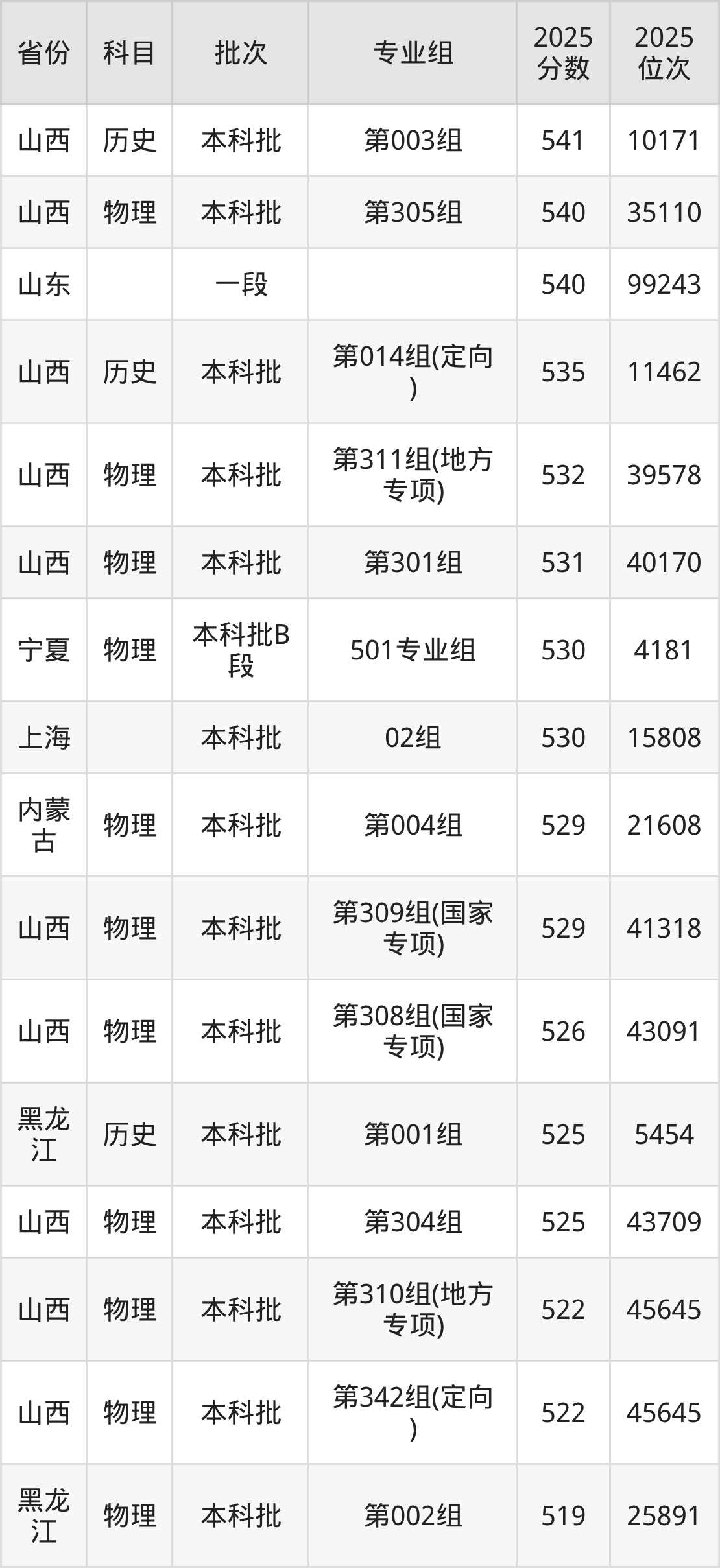 一、山西大学2025年专业录取分数线