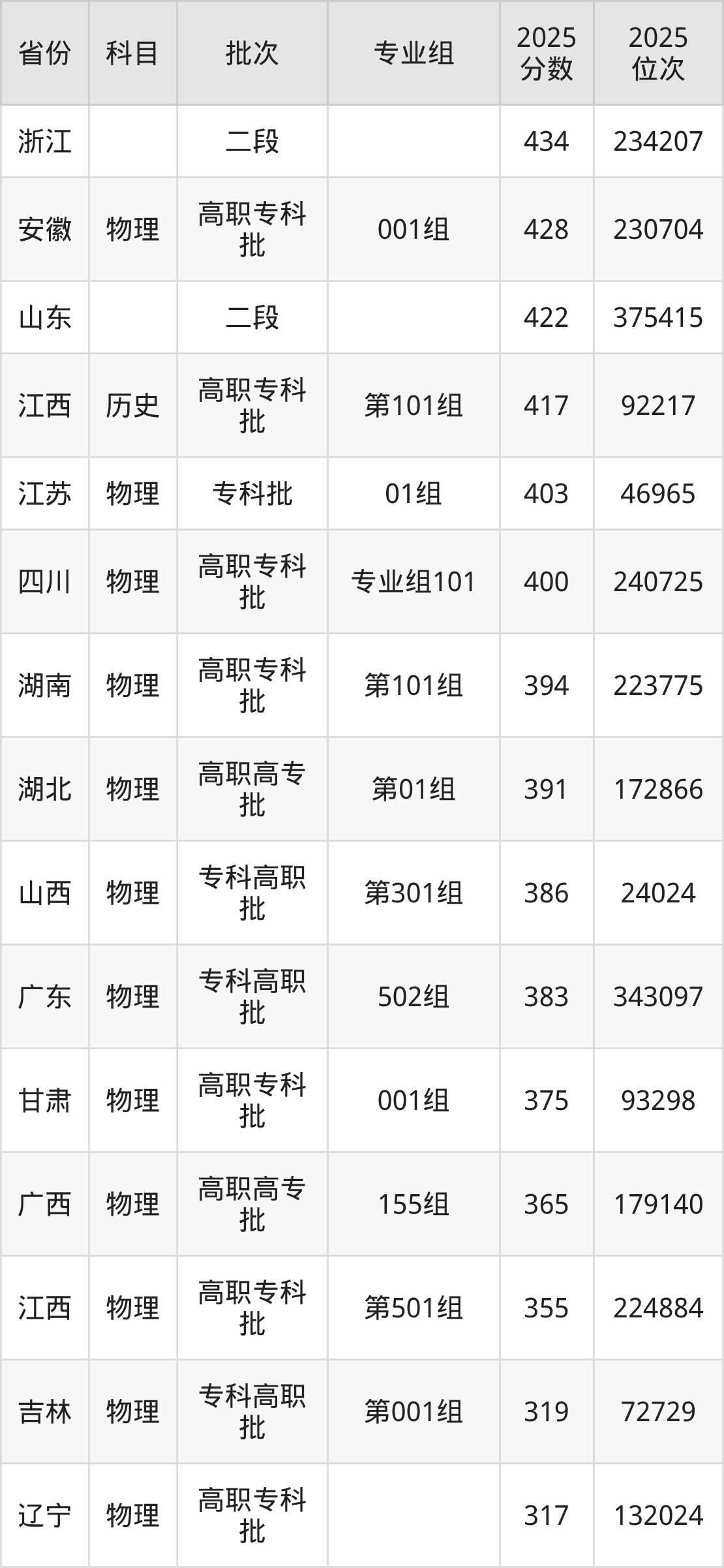 2025年江西制造职业技术学院全国录取分数线317分到434分,录取最高在浙江、录取最低在辽宁(物理)。