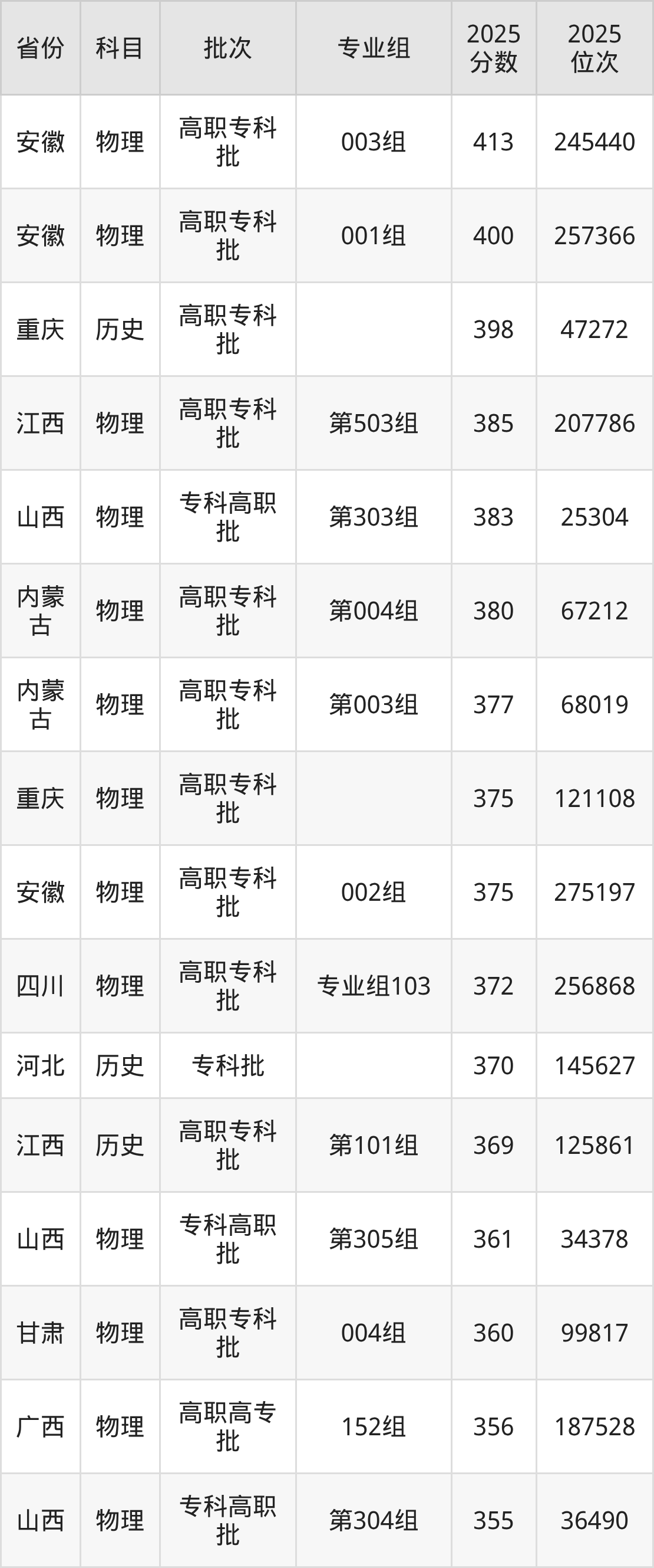 2025年大兴安岭职业学院全国录取分数线150分到413分,录取最高在安徽(003组)、录取最低在四川(专业组102)。