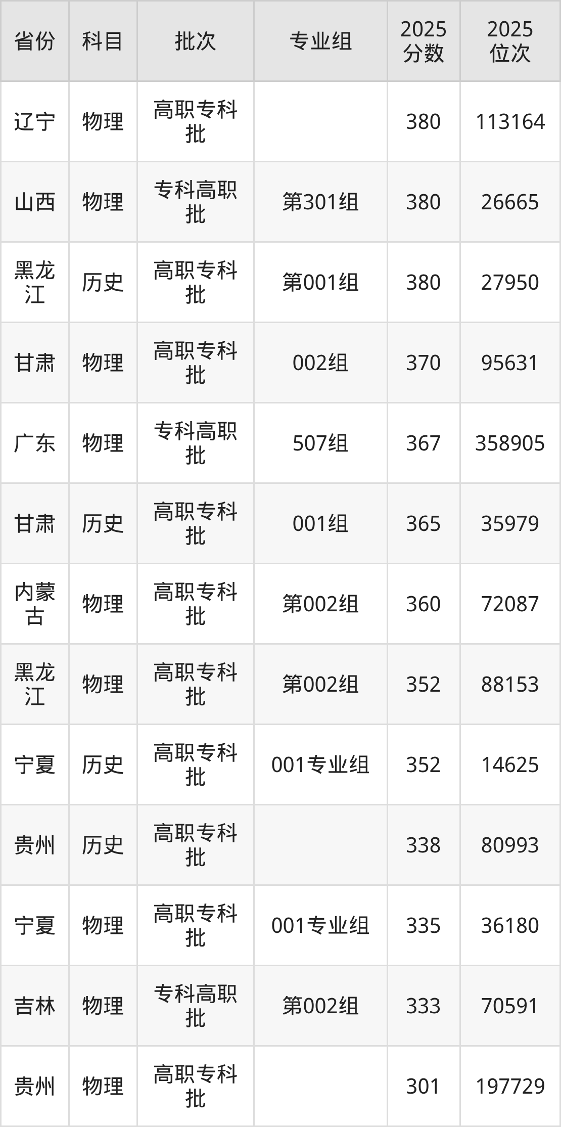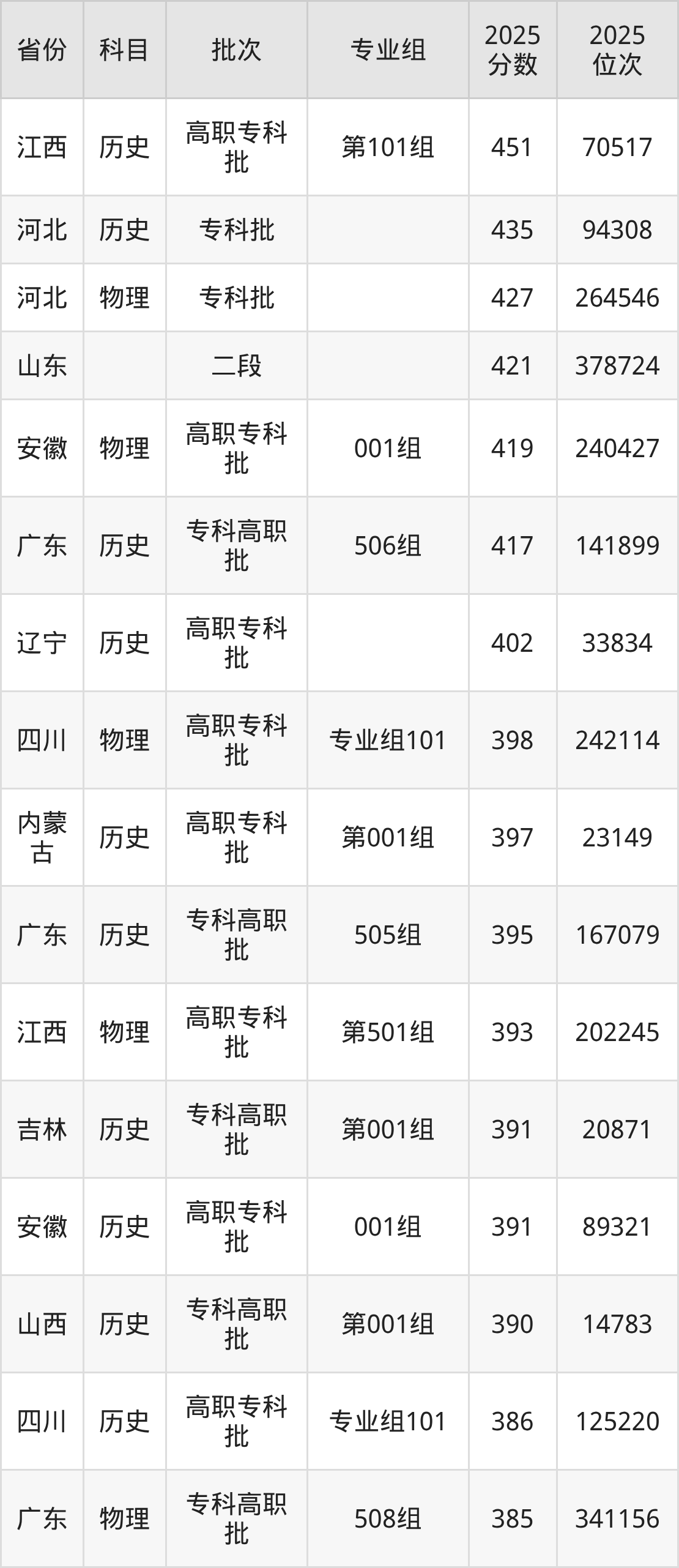 2025年石家庄信息工程职业学院全国录取分数线301分到451分,录取最高在江西(第101组)、录取最低在贵州(物理)。