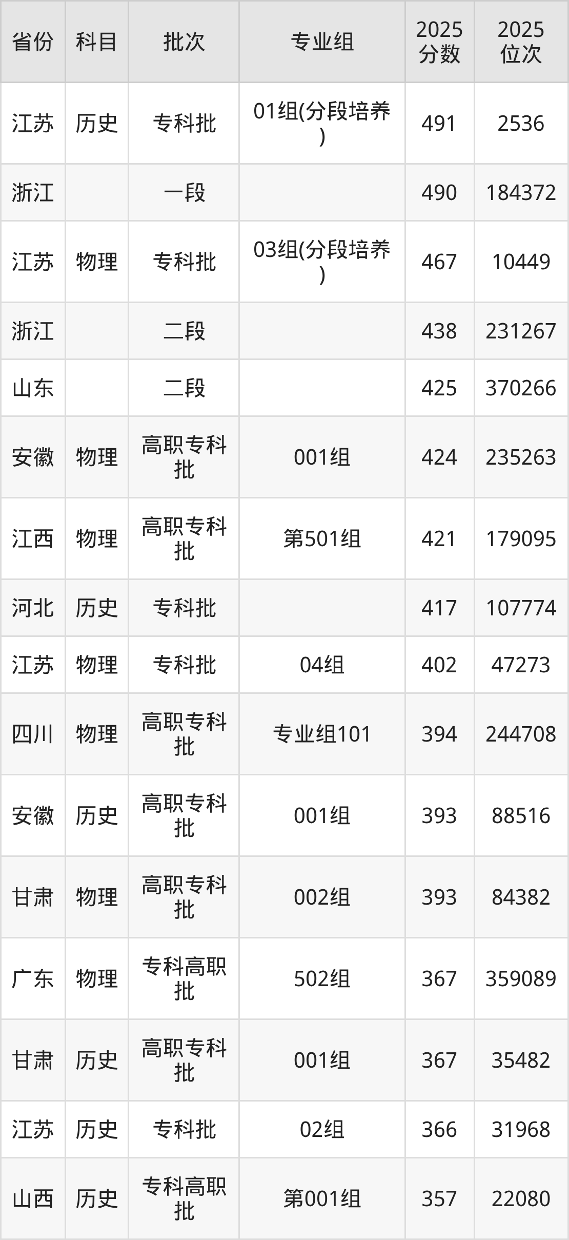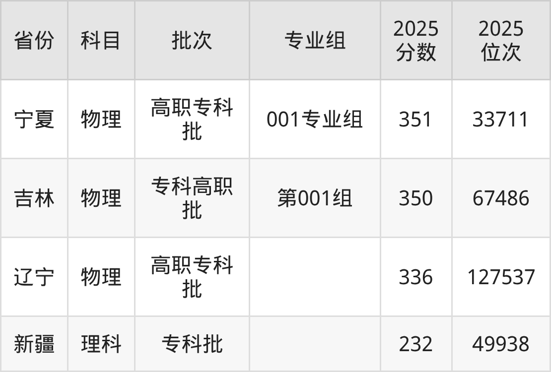 2025年扬州工业职业技术学院全国录取分数线232分到491分,录取最高在江苏(01组(分段培养))、录取最低在新疆(理科)。