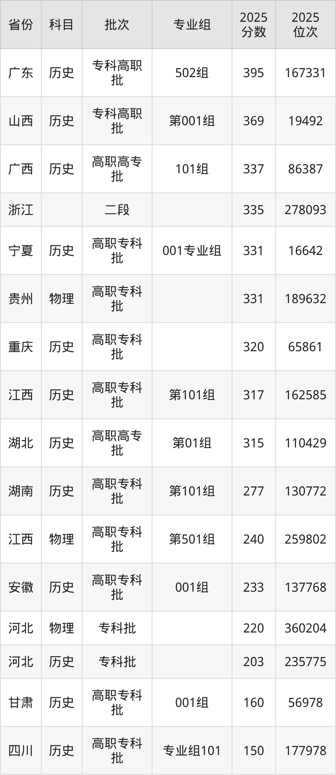 2025年江西洪州职业学院全国录取分数线150分到395分,录取最高在广东(502组)、录取最低在四川(专业组101)。