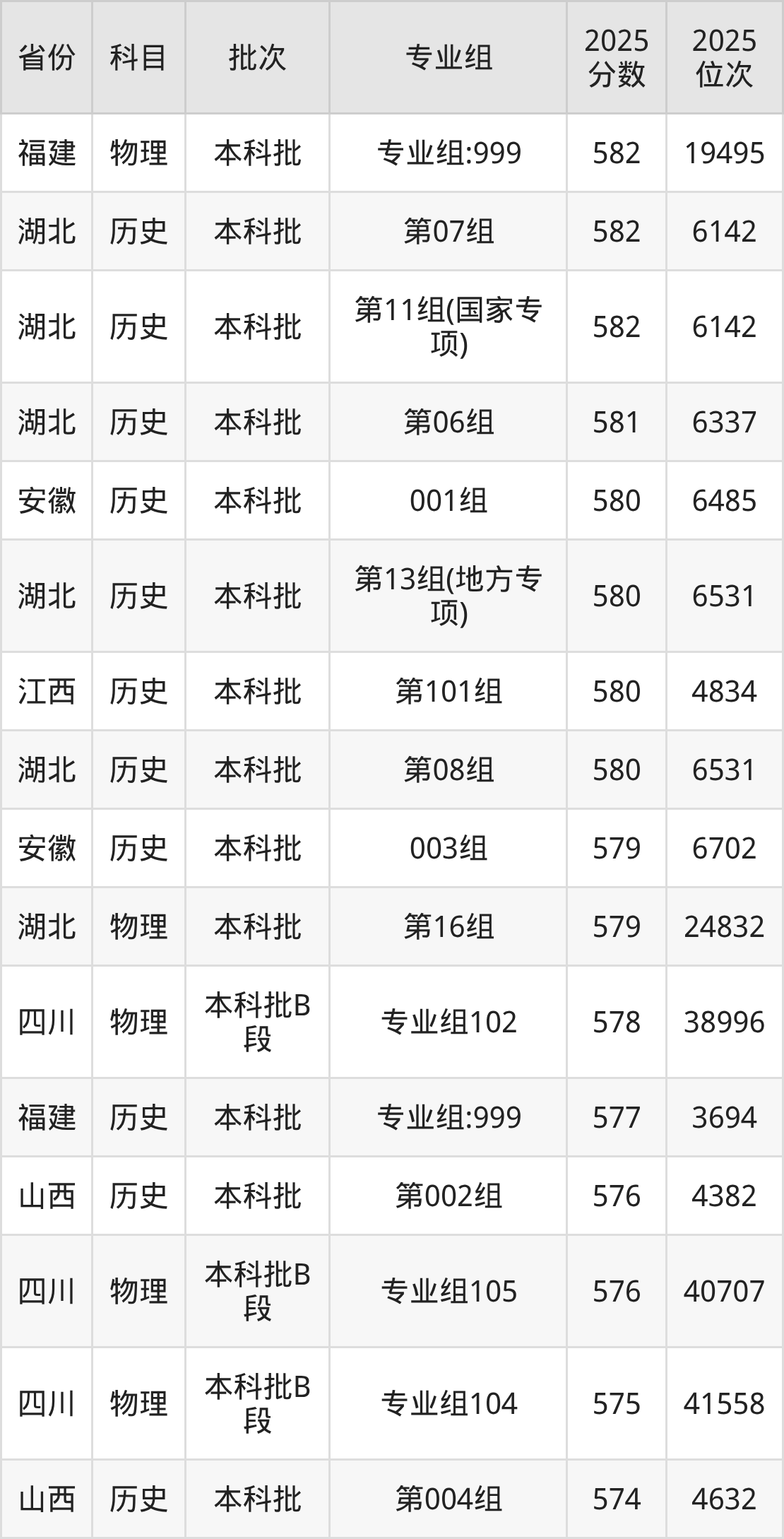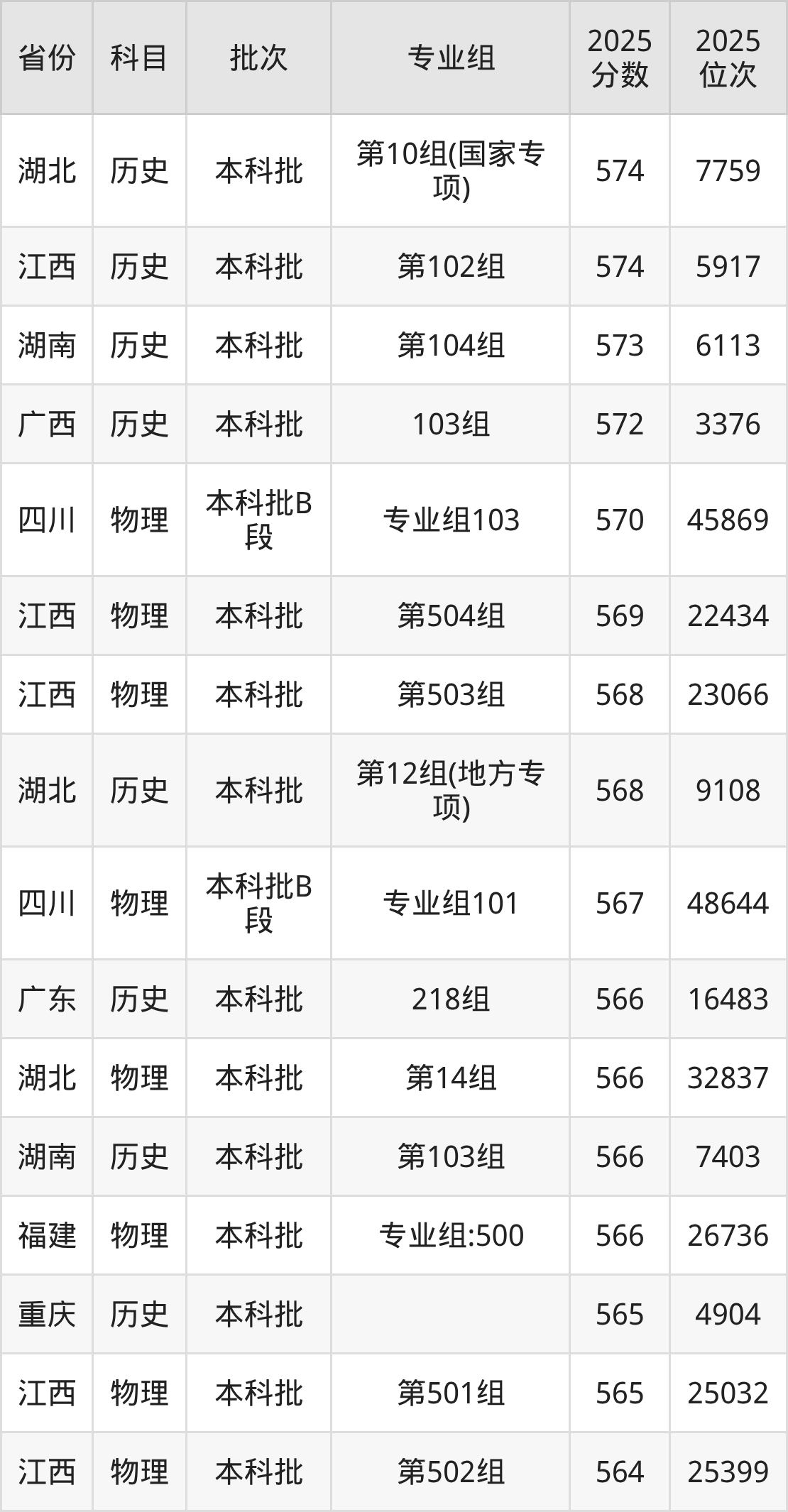 一、湖北大学2025年专业录取分数线