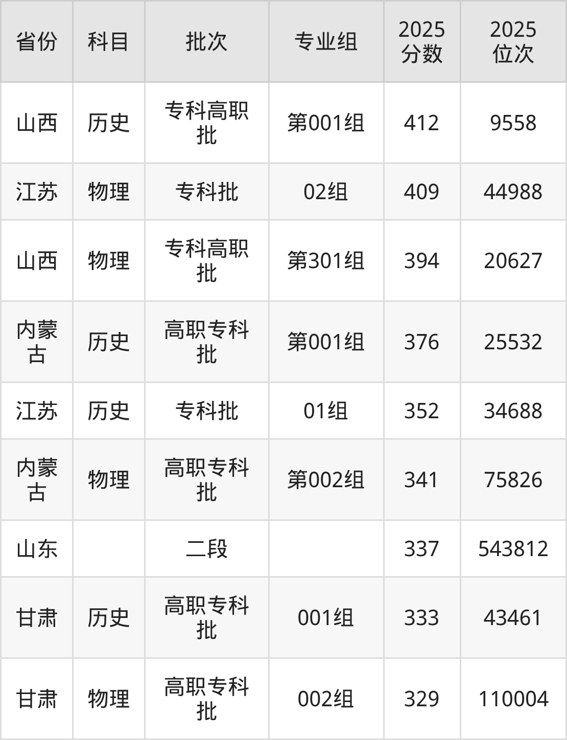 2025年郑州电力职业技术学院全国录取分数线329分到412分,录取最高在山西(第001组)、录取最低在甘肃(002组)。