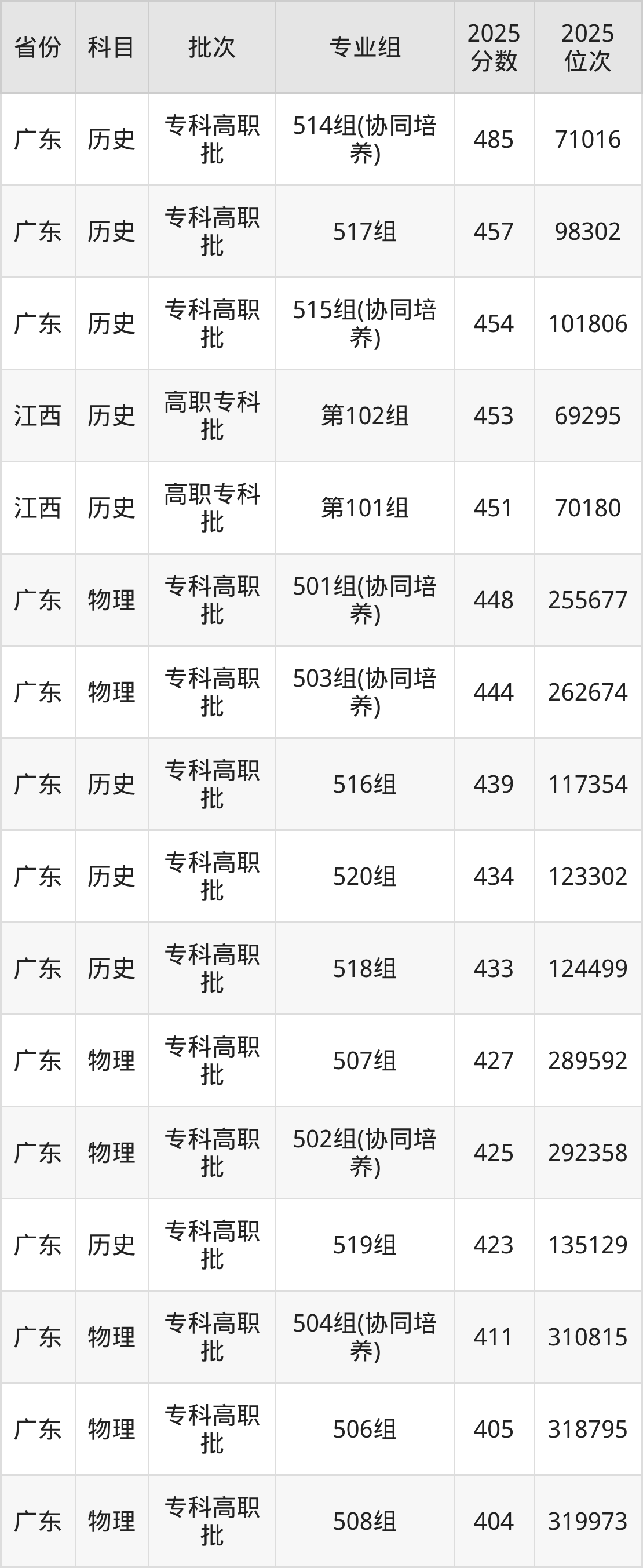 2025年清远职业技术学院全国录取分数线180分到485分,录取最高在广东(514组(协同培养))、录取最低在山西(第001组)。