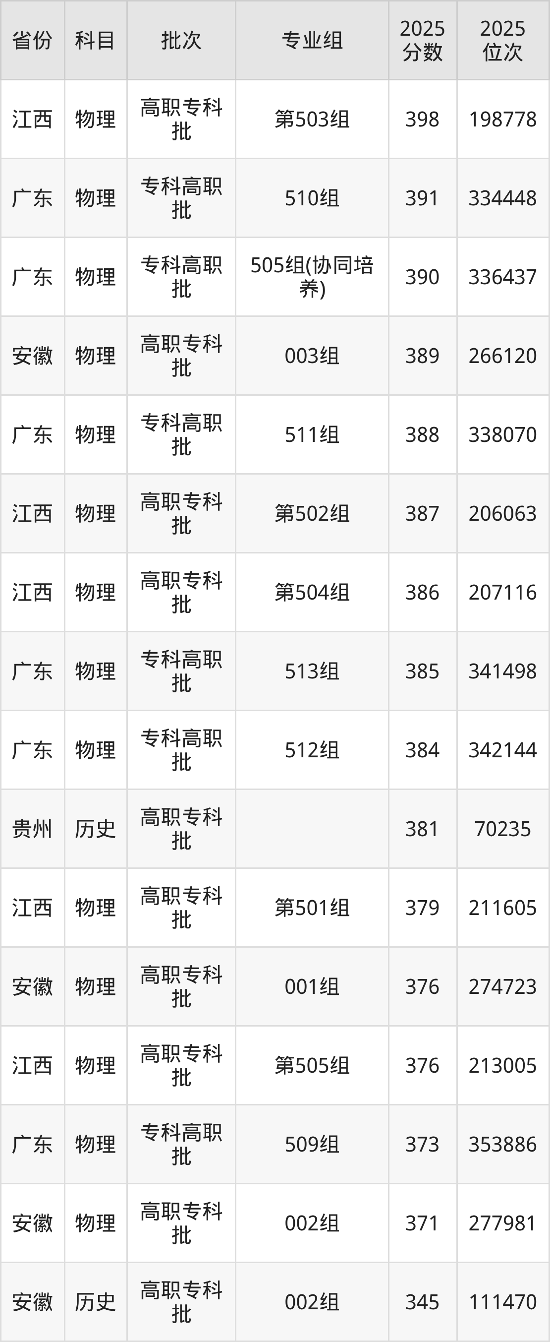 参考2025年贵州省高考招录数据,按照分数线从高到低依次为大家展示清远职业技术学院各个专业录取分数线。