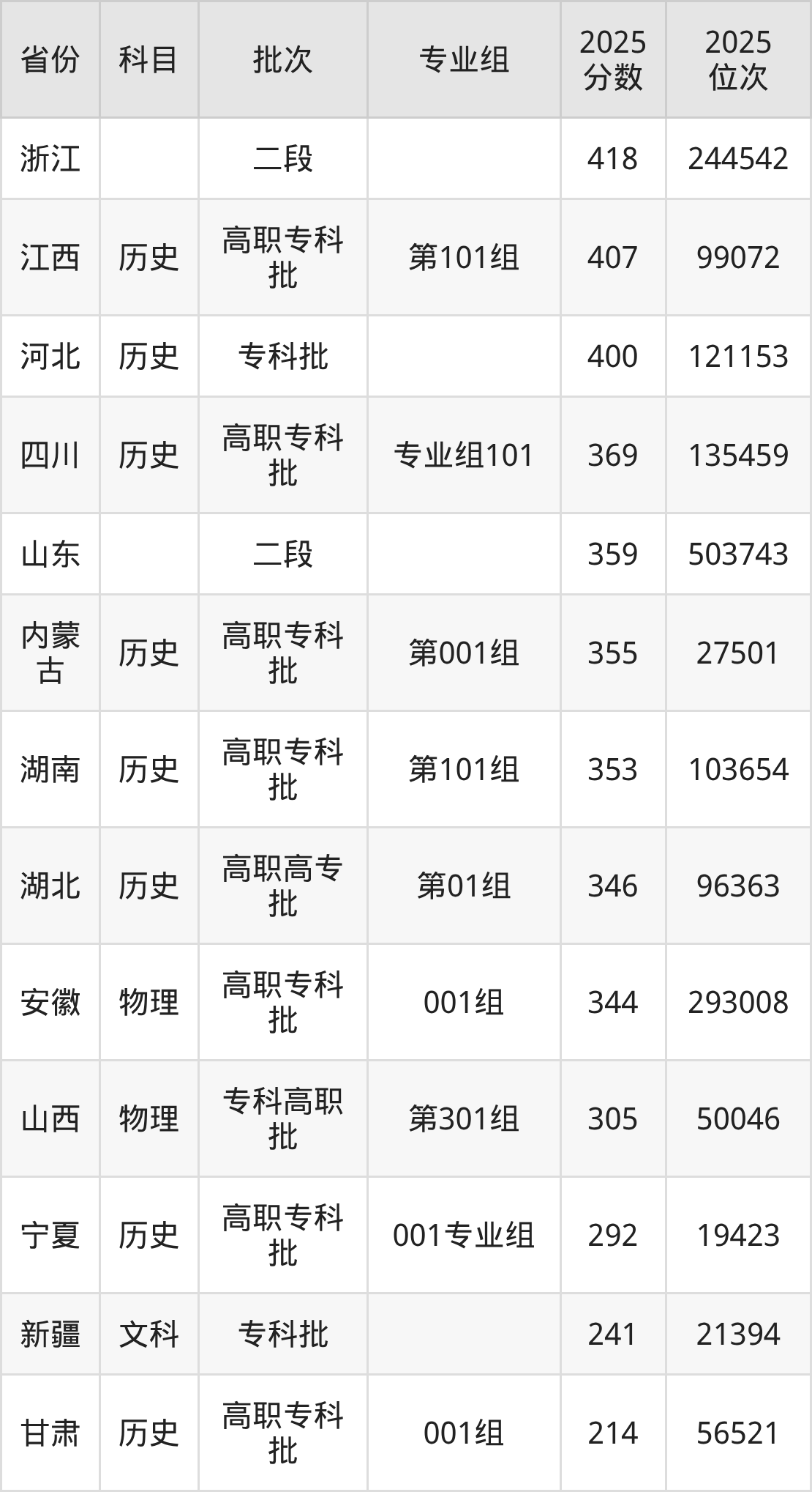 2025年郑州旅游职业学院全国录取分数线214分到418分,录取最高在浙江、录取最低在甘肃(001组)。