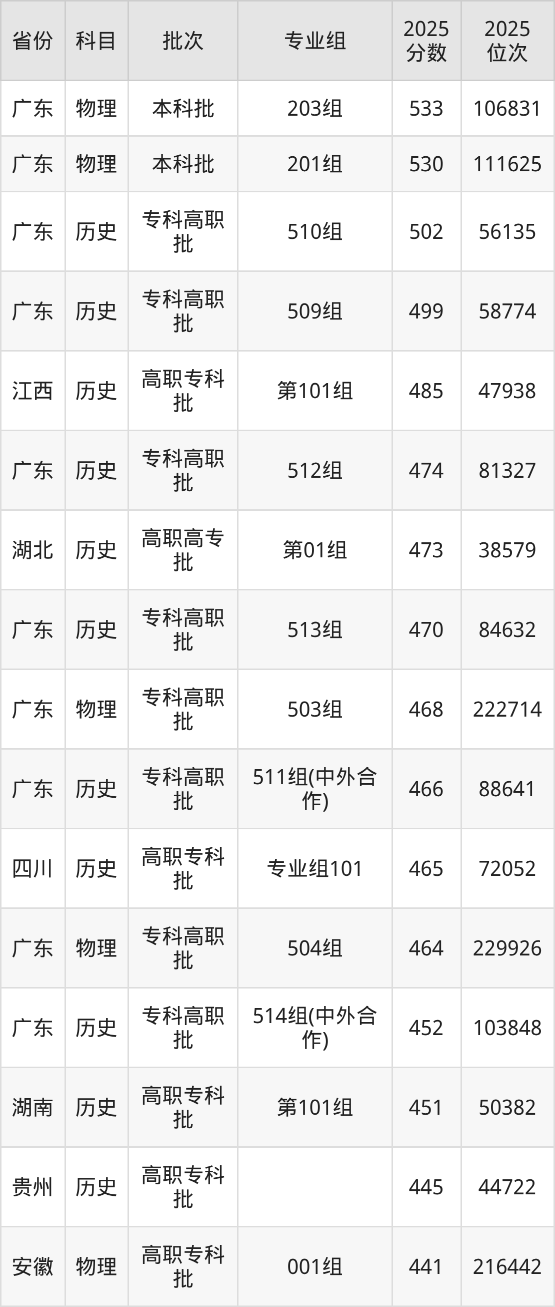 参考2025年贵州省高考招录数据,按照分数线从高到低依次为大家展示顺德职业技术大学各个专业录取分数线。