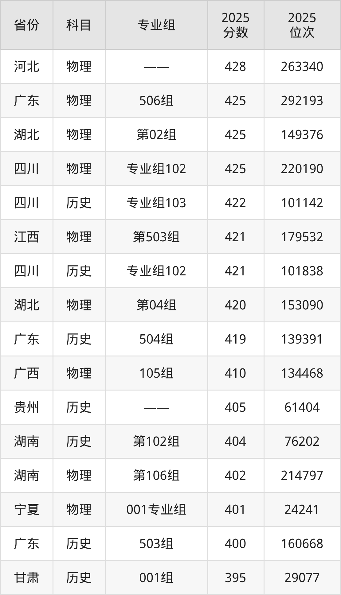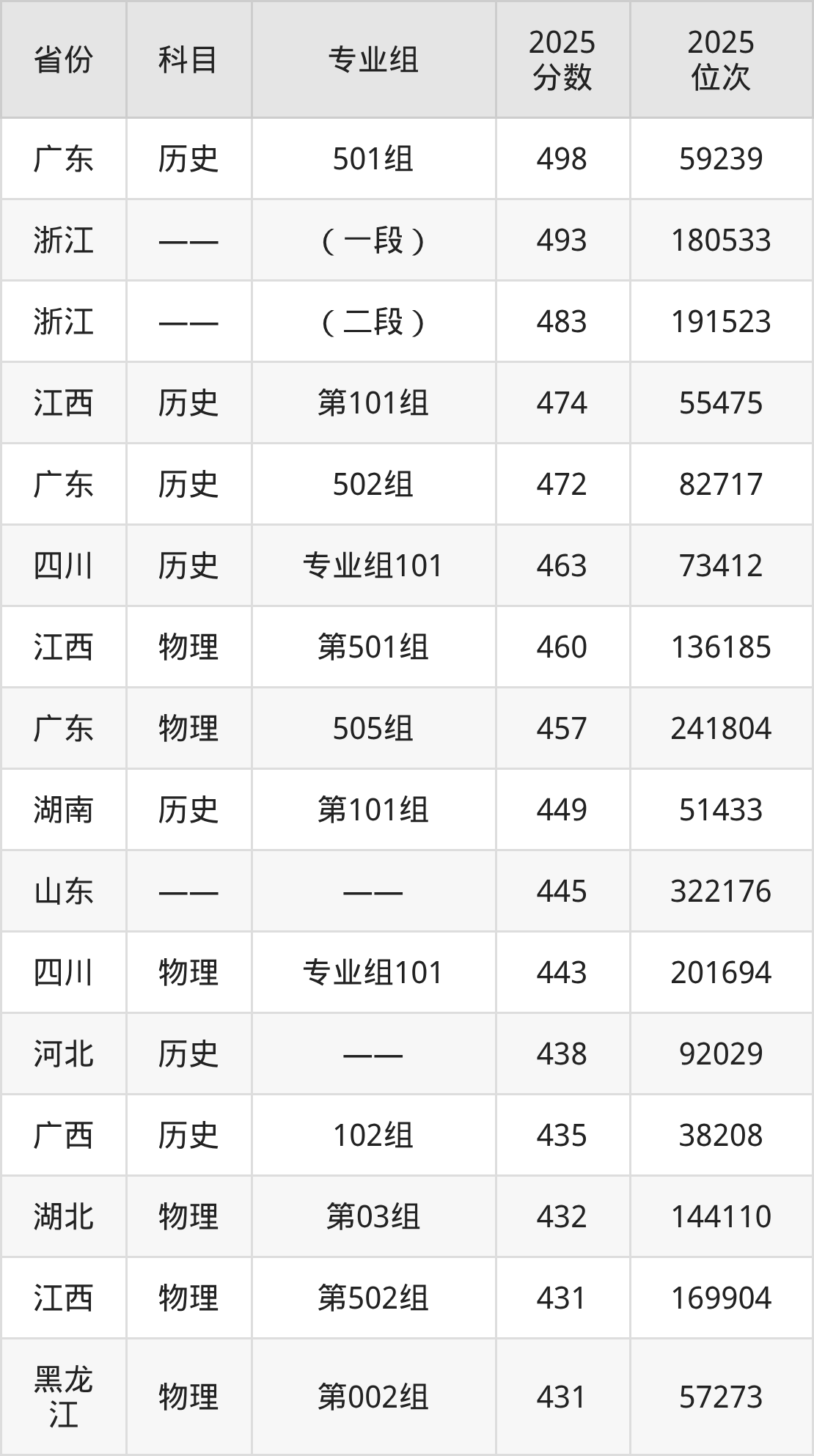 2025年永州职业技术学院全国录取分数线150分到498分,录取最高在广东(历史类501组)、录取最低在四川(物理类专业组104)。