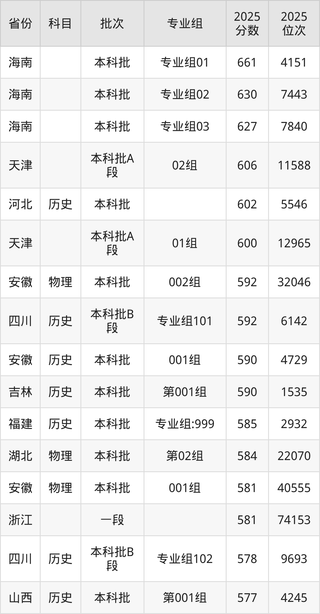 2025年北京工商大学全国录取分数线501分到661分,录取最高在海南(专业组01)、录取最低在上海(02组)。