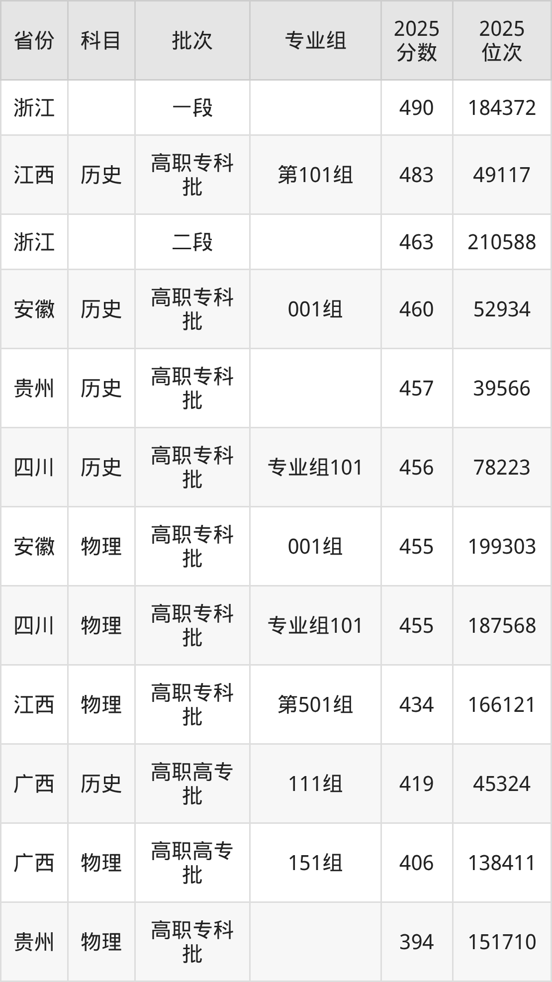 2025年杭州科技职业技术学院全国录取分数线394分到490分,录取最高在浙江、录取最低在贵州(物理)。