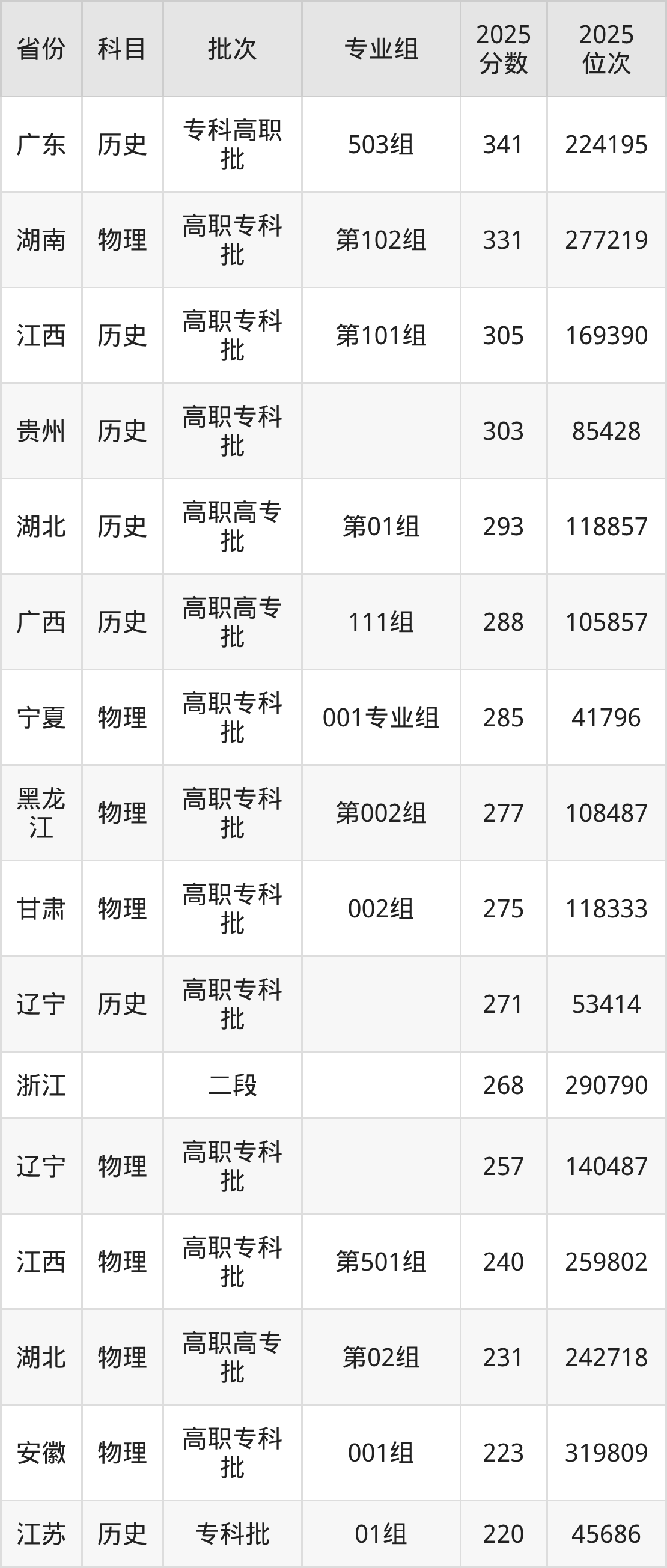 2025年巴中职业技术学院全国录取分数线150分到341分,录取最高在广东(503组)、录取最低在四川(专业组102)。