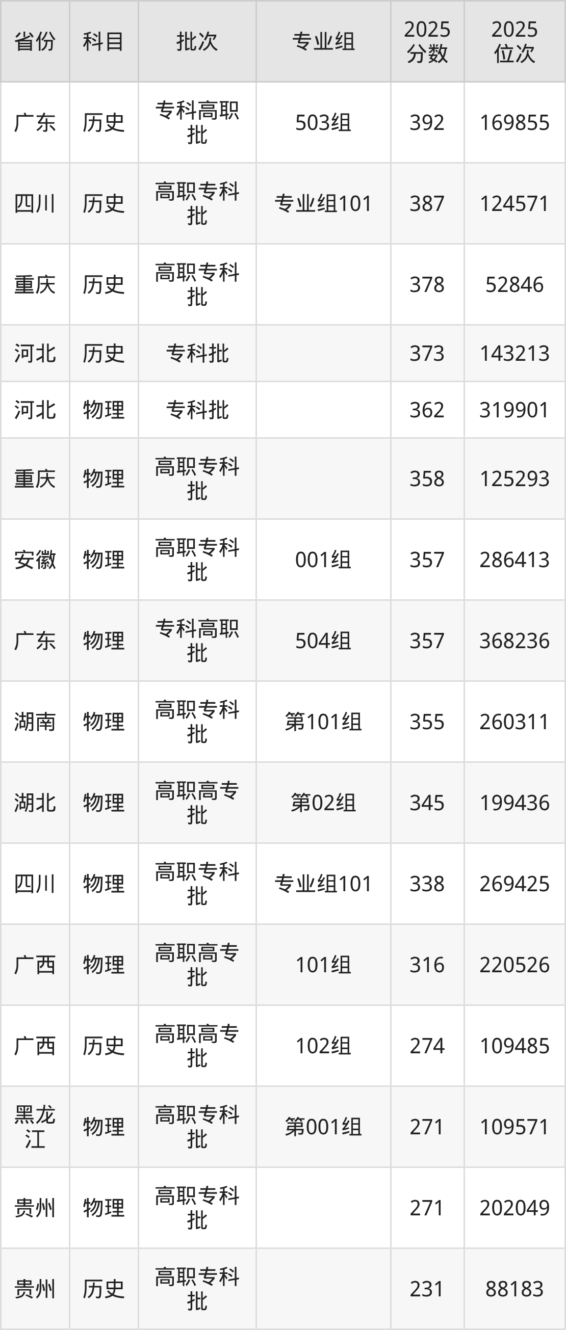 2025年遵义职业技术学院全国录取分数线169分到392分,录取最高在广东(503组)、录取最低在吉林(第001组)。