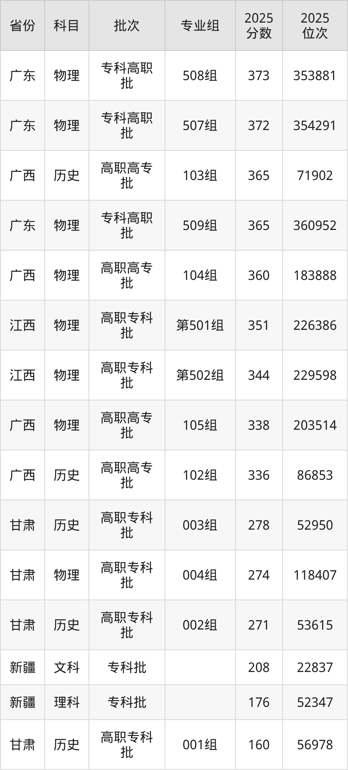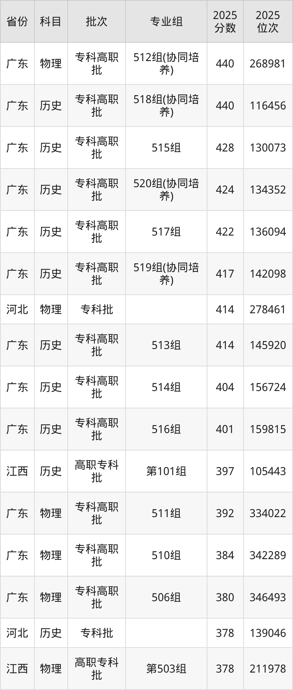 2025年罗定职业技术学院全国录取分数线160分到440分,录取最高在广东(512组(协同培养))、录取最低在甘肃(001组)。