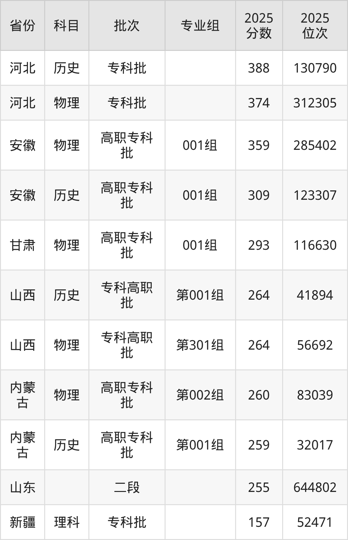 2025年德州职业技术学院全国录取分数线157分到388分,录取最高在河北(历史)、录取最低在新疆(理科)。