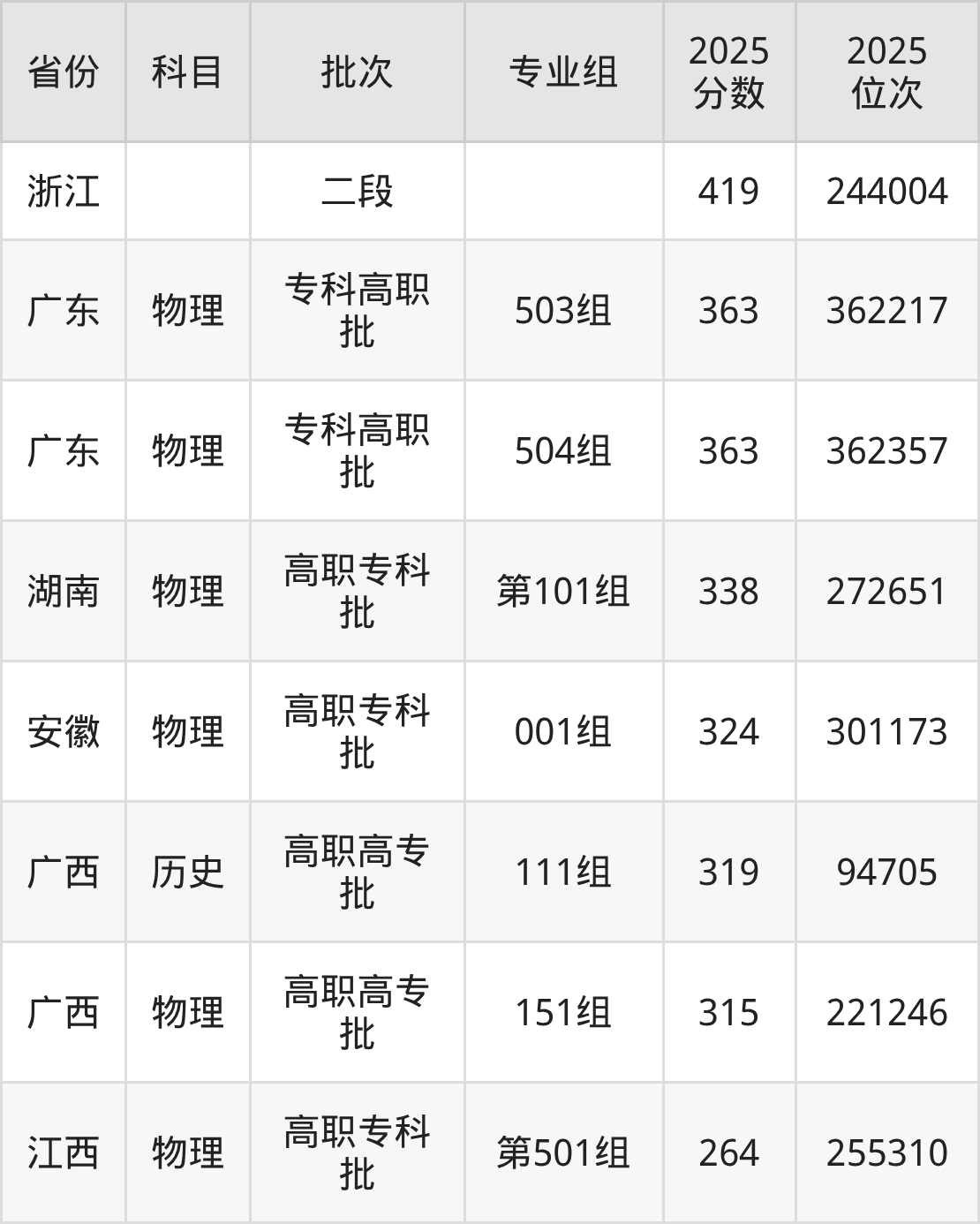参考2025年浙江省高考招录数据,按照分数线从高到低依次为大家展示广西质量工程职业技术学院各个专业录取分数线。