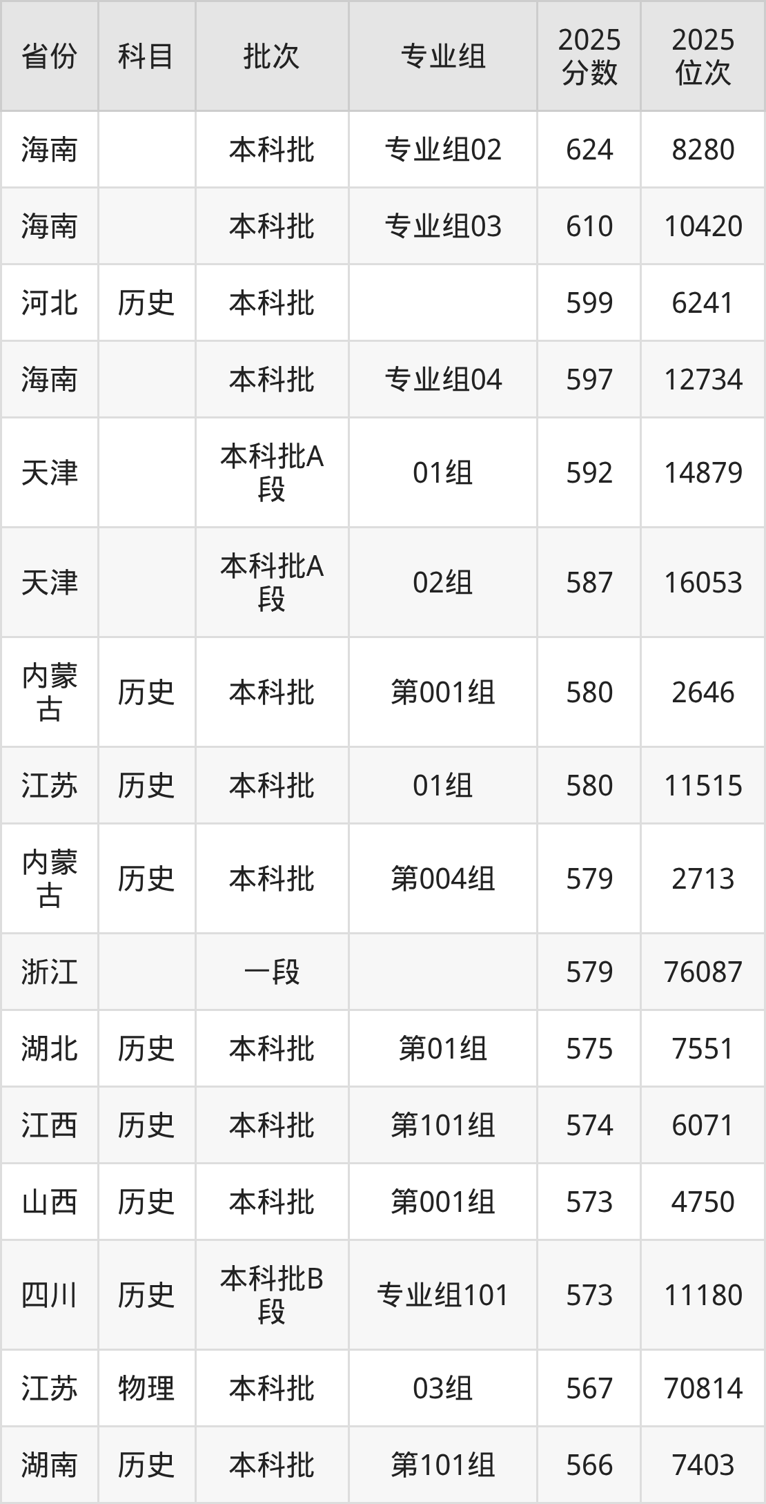 2025年上海立信会计金融学院全国录取分数线416分到624分,录取最高在海南(专业组02)、录取最低在新疆(理科)。