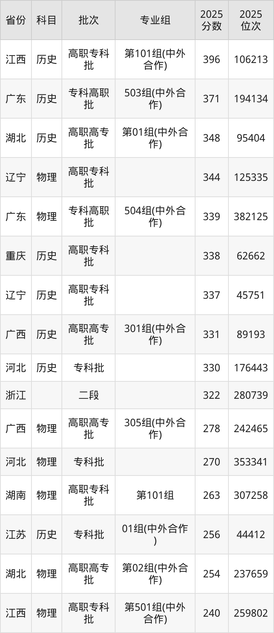 2025年福州墨尔本理工职业学院全国录取分数线180分到396分,录取最高在江西(第101组(中外合作))、录取最低在重庆(物理)。