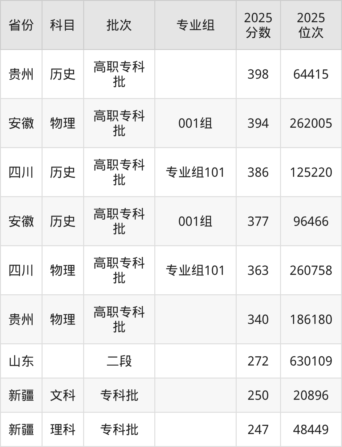 2025年商丘职业技术学院全国录取分数线247分到398分,录取最高在贵州(历史)、录取最低在新疆(理科)。